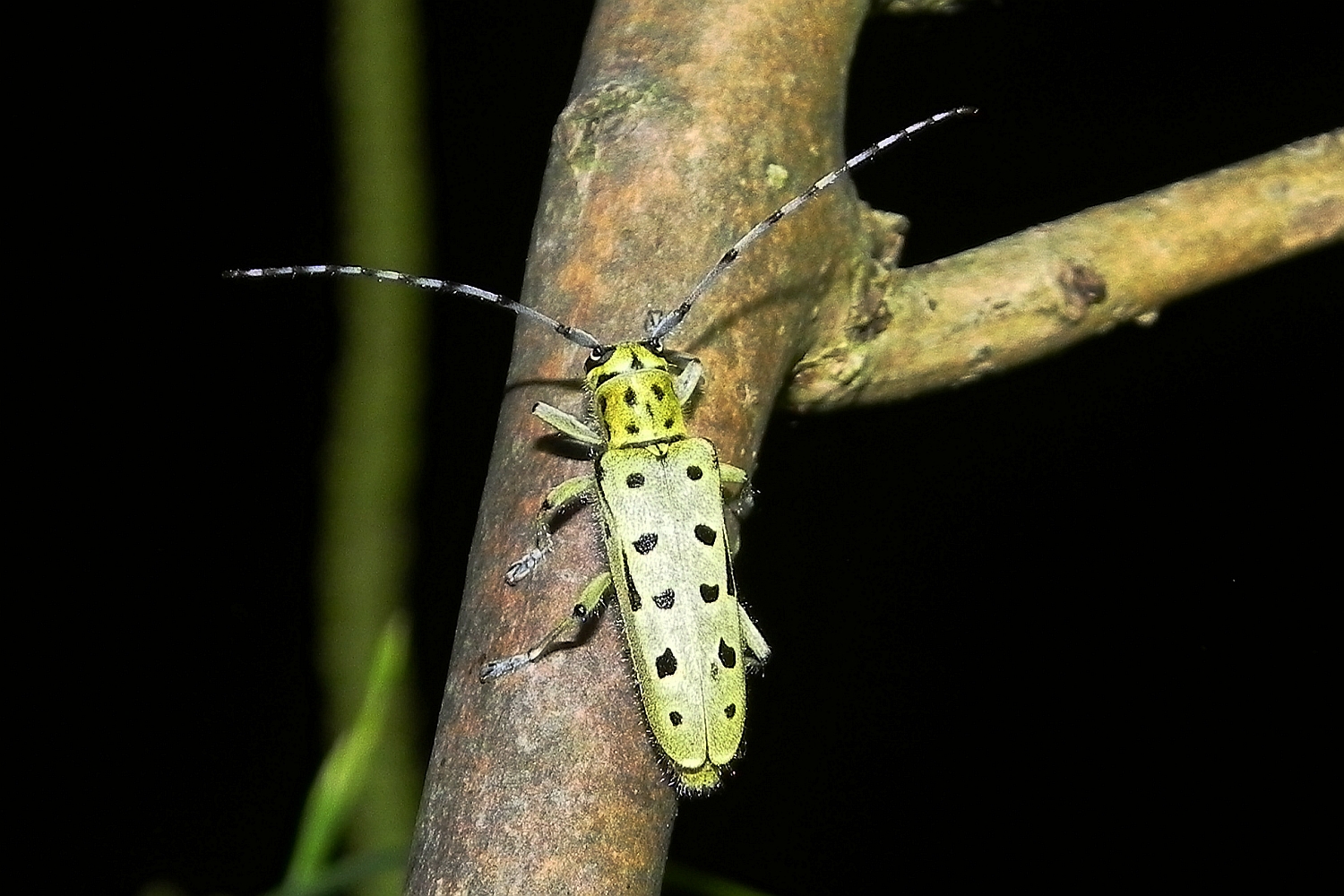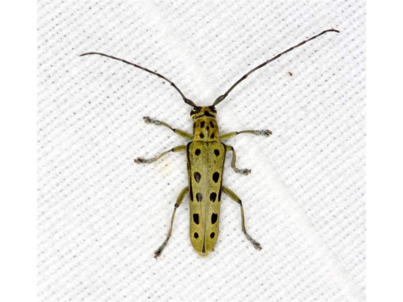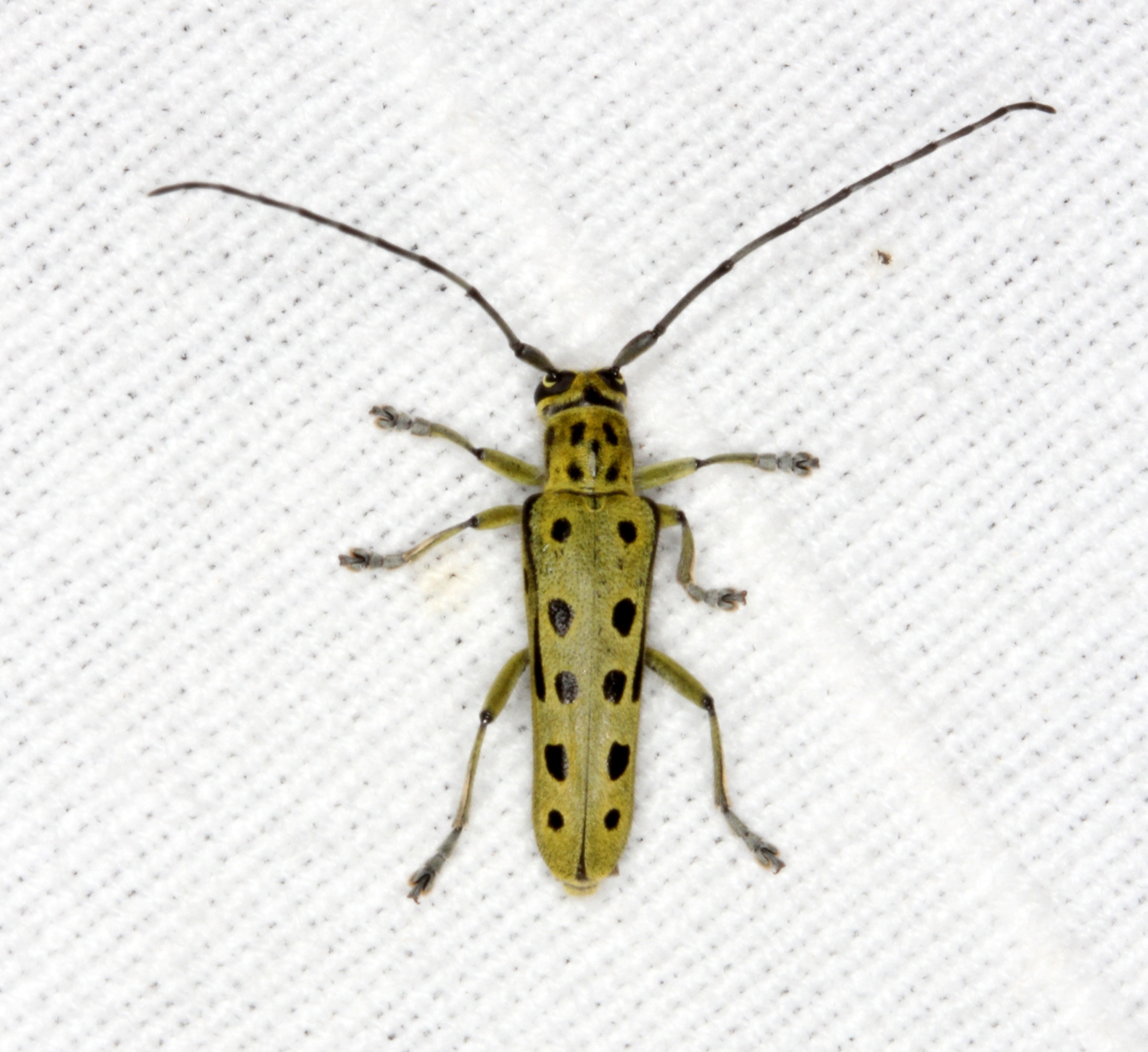 Die Flügeldecken haben entlang der Schultern einen langen schwarzen Streifen. Unter diesen Streifen ist an den Flügeldeckenränden jeweils ein schwarzer Fleck. Jede Flügeldecke hat fünf in einer Längsreihe angeordnete schwarze Flecke. Der Halsschild hat acht schwarze Flecke, je zwei an den Seiten und vier in der Mitte. Die Flecken können in Größe und Anzahl variieren, auch ist die gelbgrüne bis graue Tomentierung variabel.