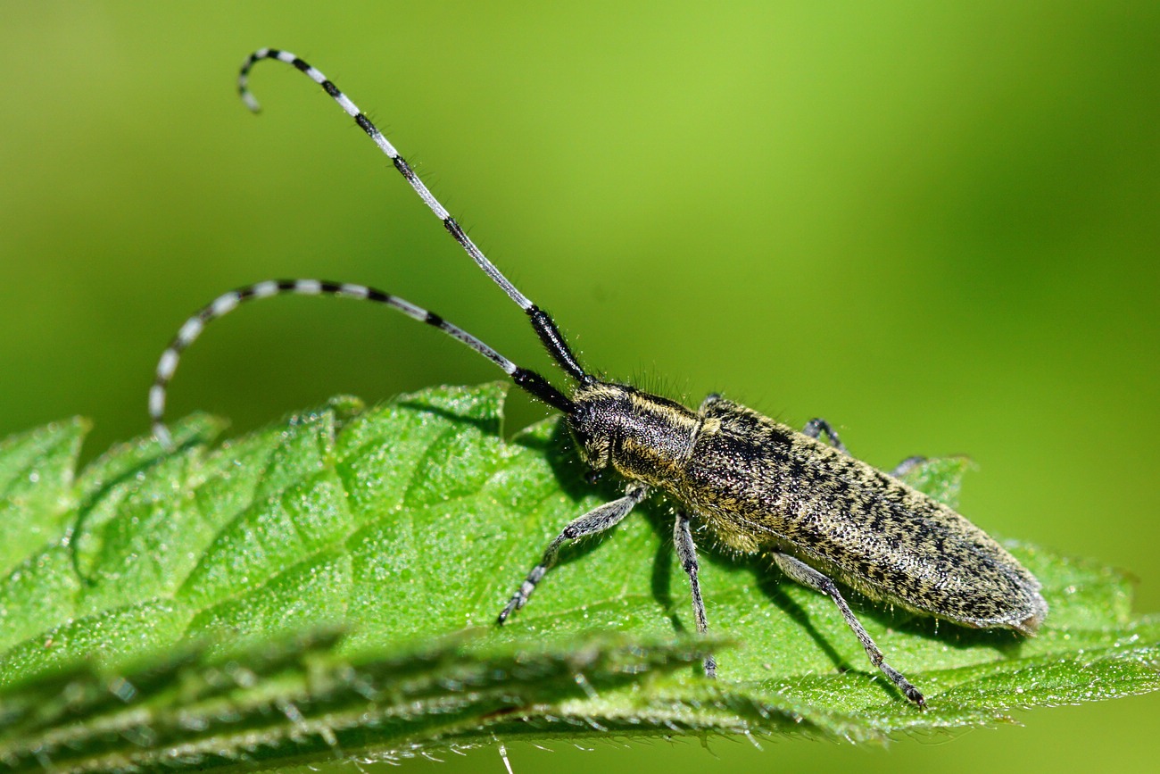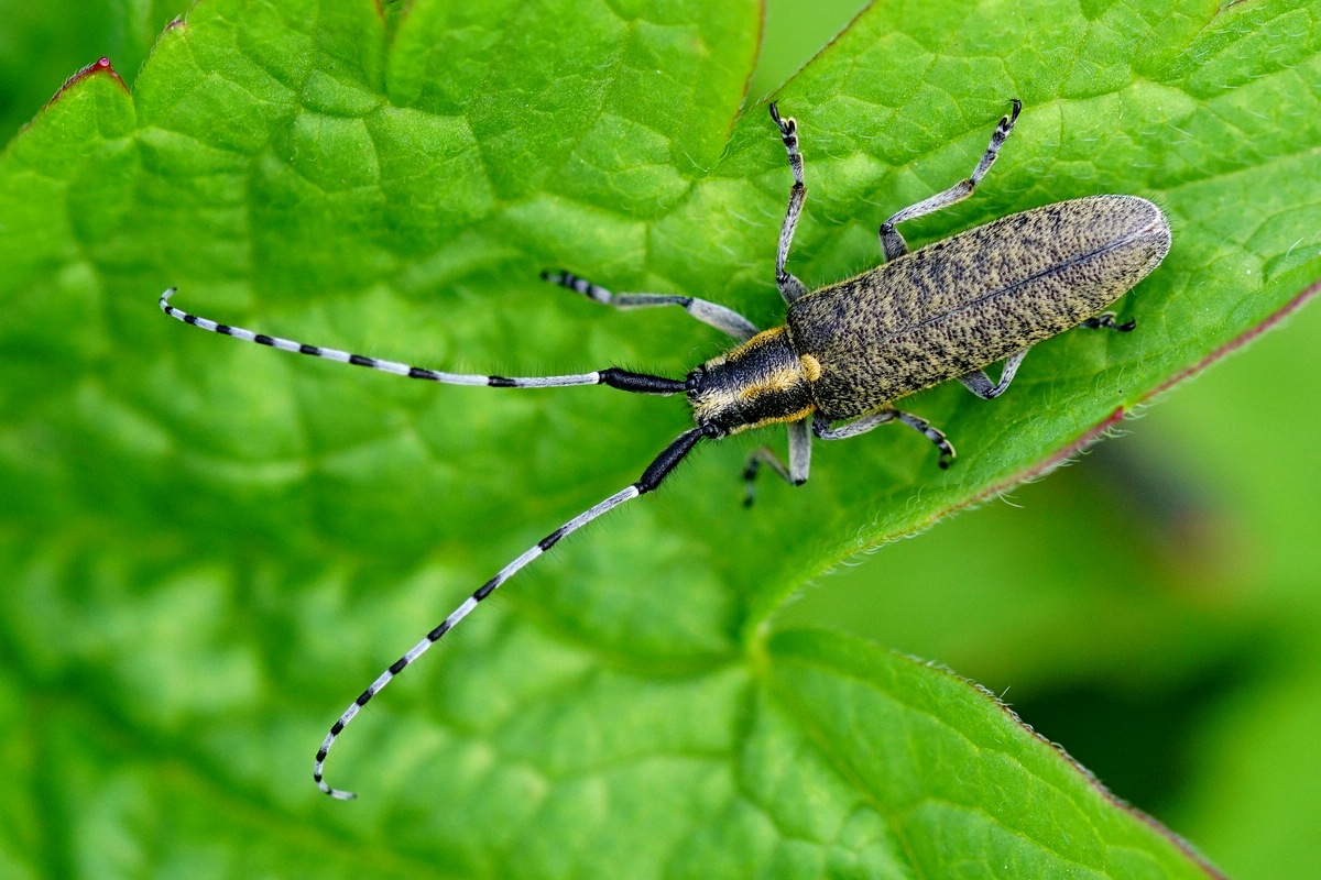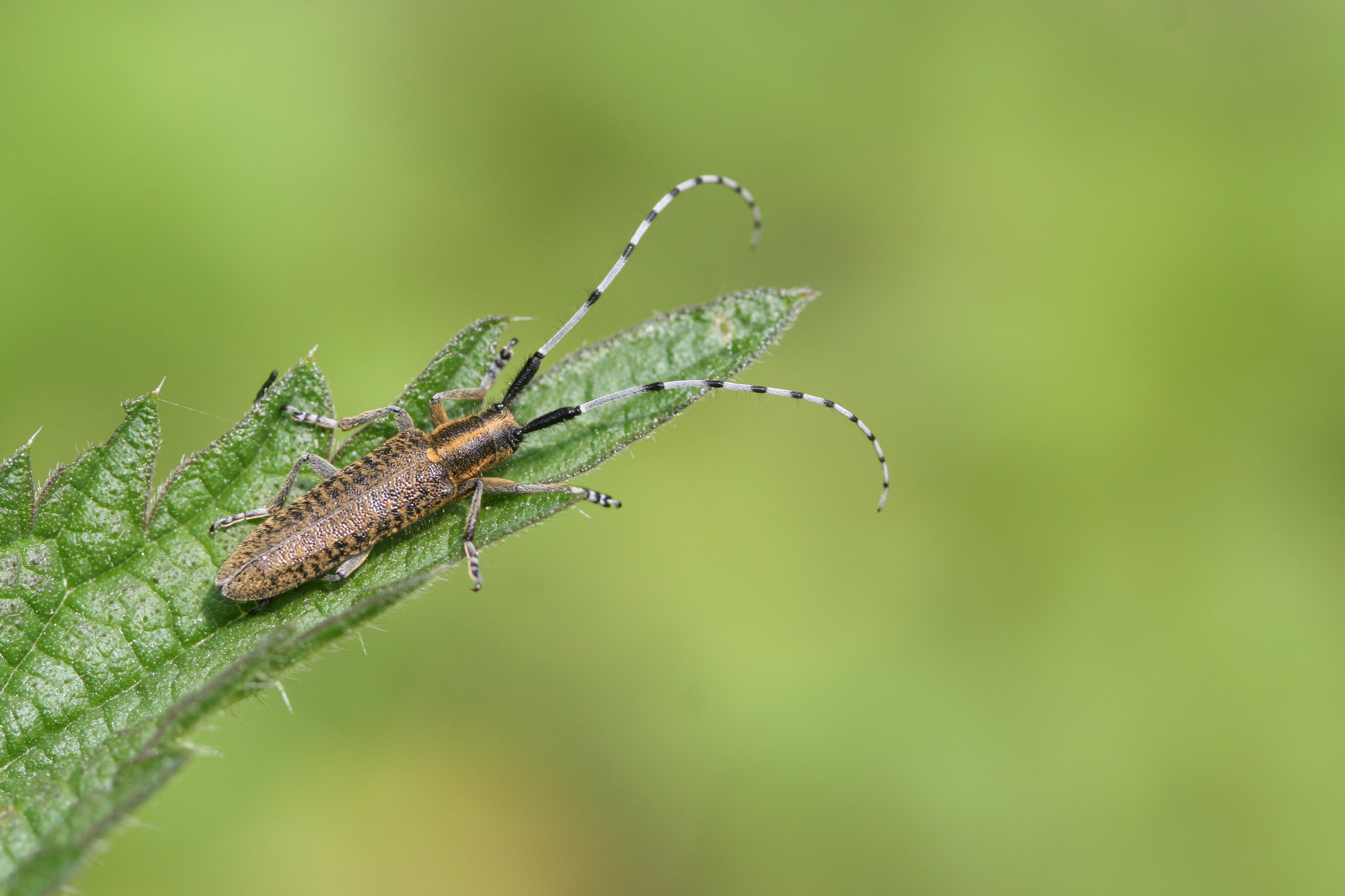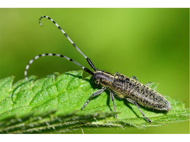 (Agapanthia cardui) Flügeldeckennaht weiß tomentiert. Artischocken-Scheckhornbock
