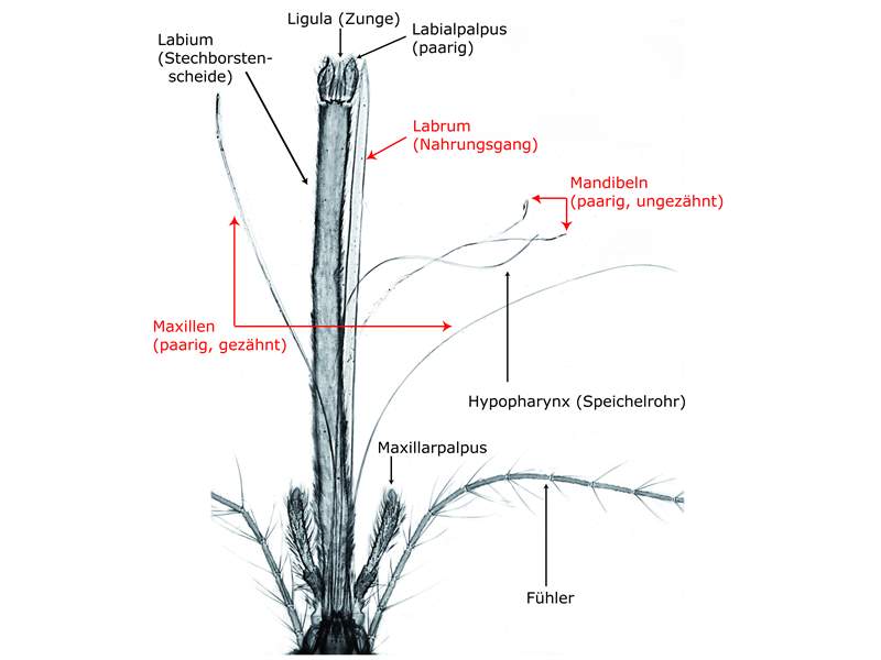 Stechrüssel eines Weibchens von Aedes punctor. Die eigentlichen Stechwerkzeuge, die in die Haut des Wirtes eindringen, sind Labrum, Maxillen und Mandibeln. Aufnahme mit dem Lichtmikroskop. (© Uwe Kallweit)( Bild vergrößern)