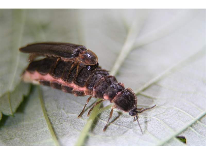 Nach der Paarung verbleibt das Männchen des Großen Leuchtkäfers stundenlang auf dem Rücken des Weibchens. Lößnitzgrund in Radebeul bei Dresden am 24. Juni 2007.