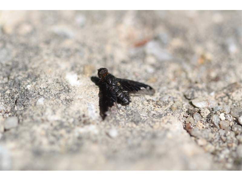 nicht über die Diskalzelle hinaus, hierdurch wirkt der Rand der Schwarzfärbung weniger ausgebuchtet und eher gerade. Körper mit einzelnen heller behaarten Partien.