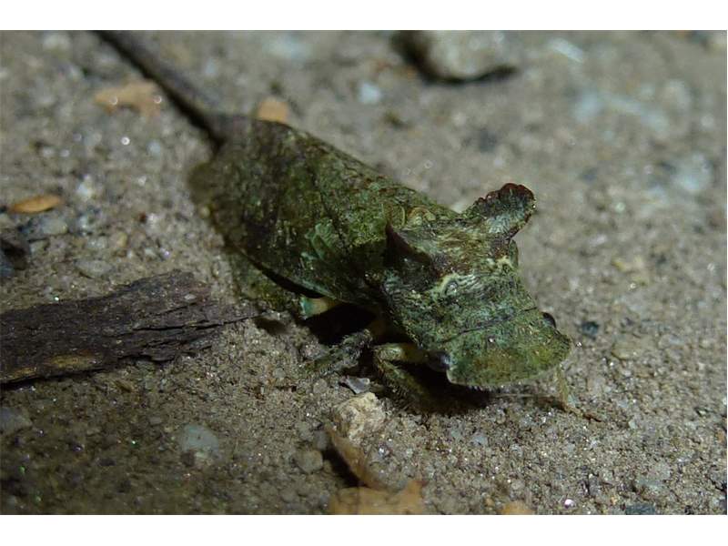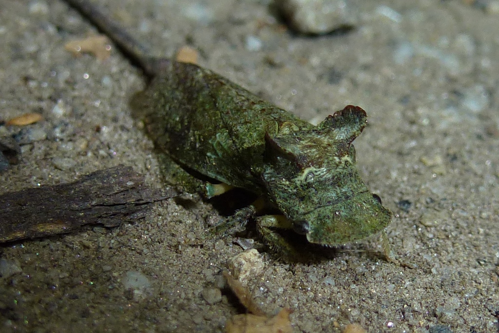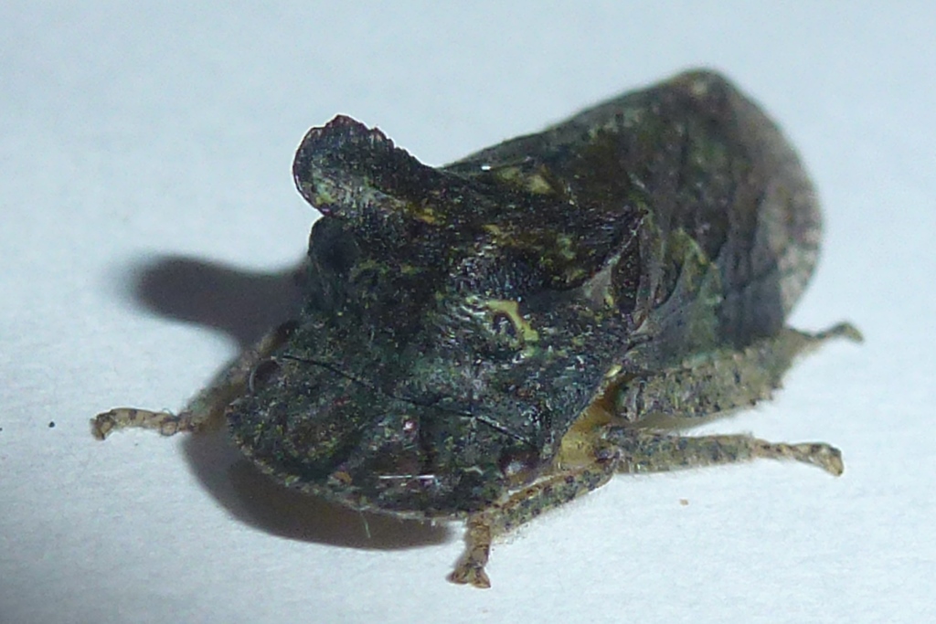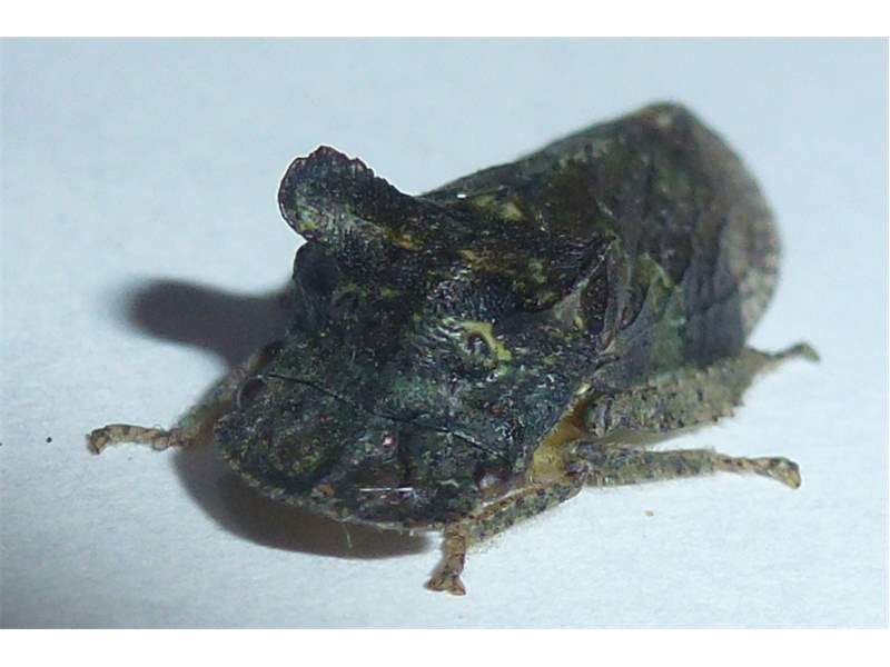 Große, braune Zikade, Pronotum seitlich mit einem Paar abgerundeter Ausstülpungen, den"Ohren". Pronotumhinterrand im Gegensatz zu Centrotus cornutus normal geformt.