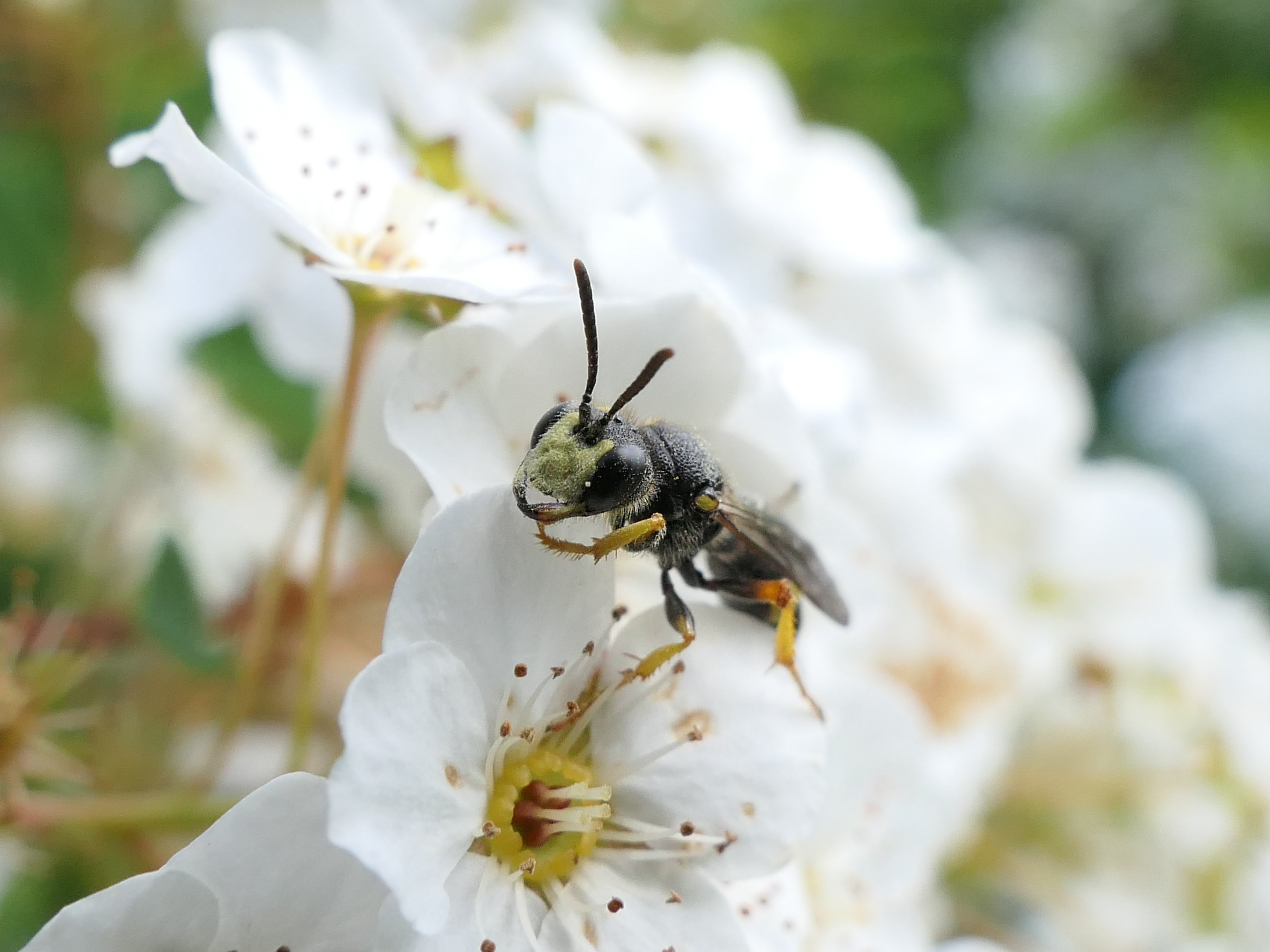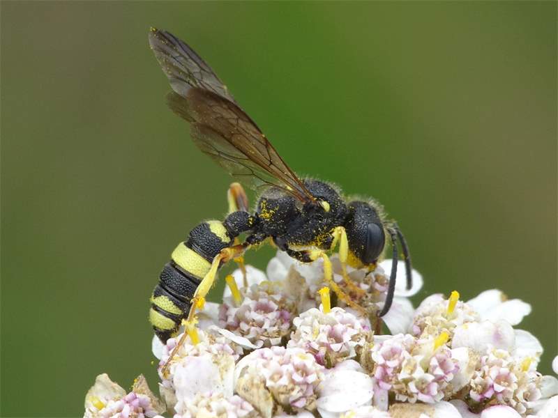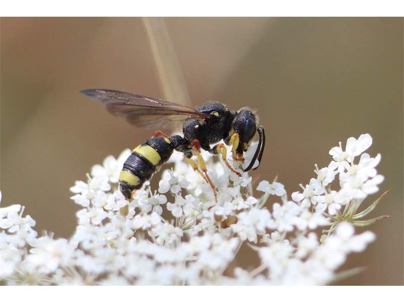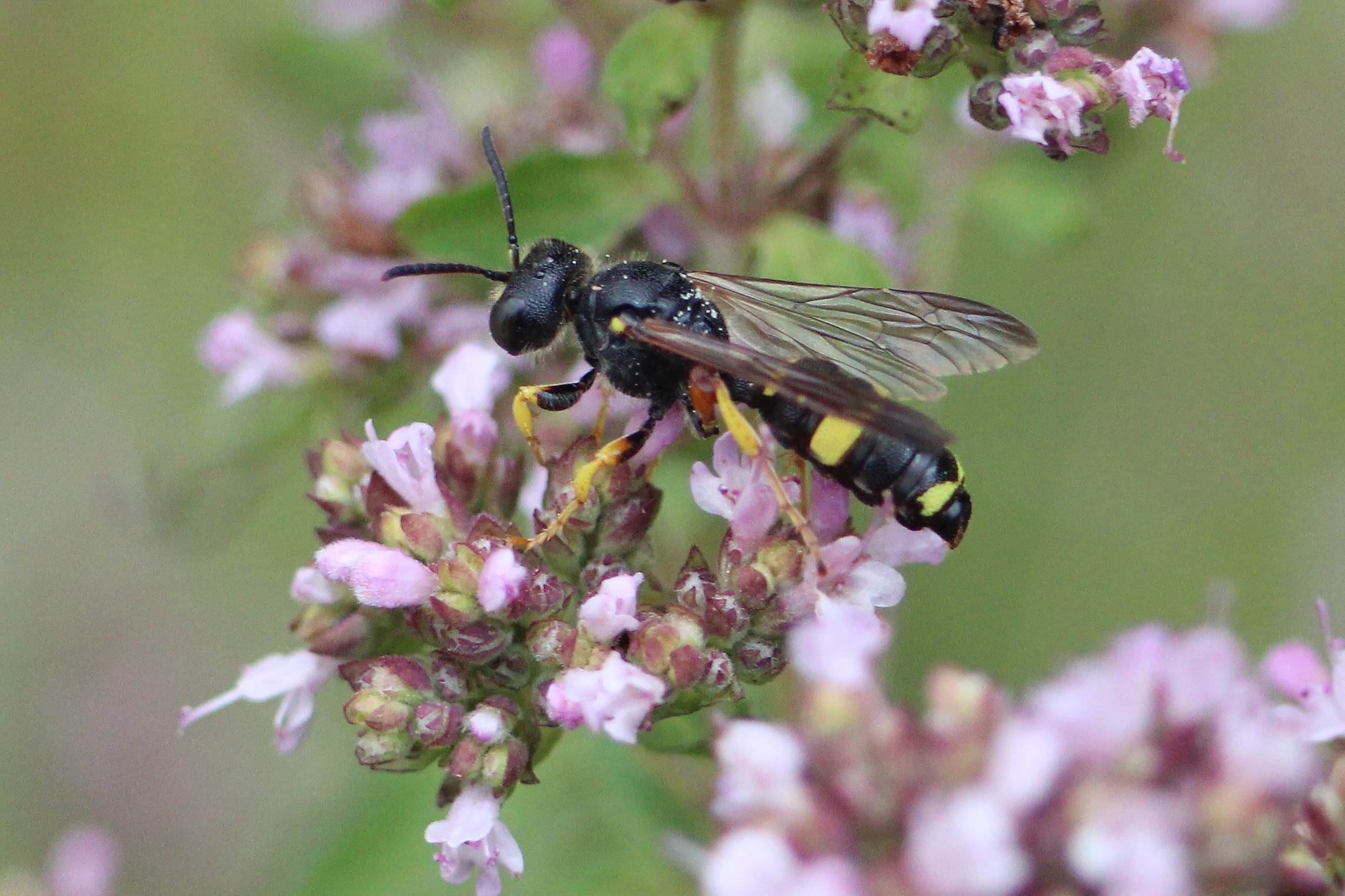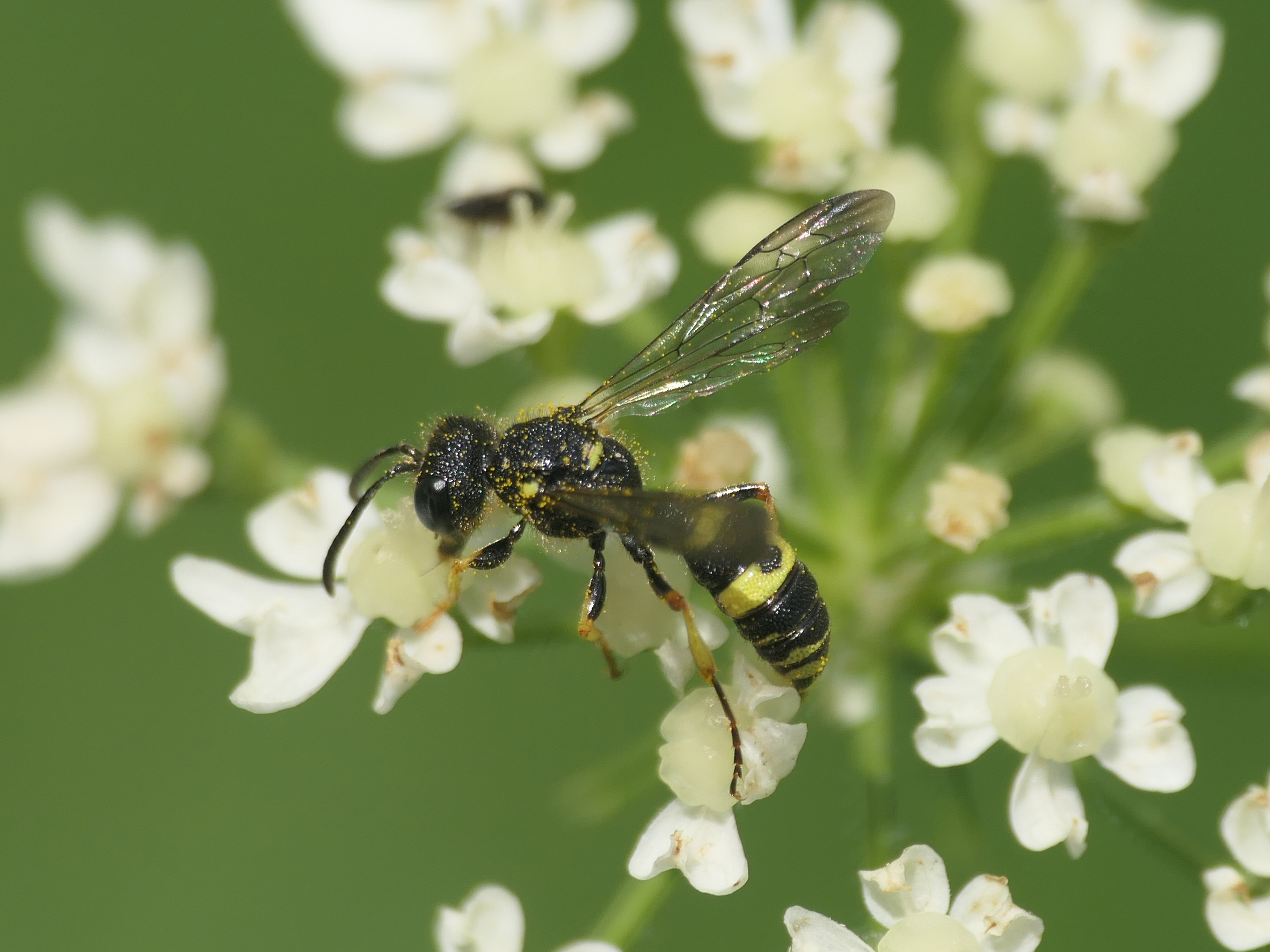 Abdomen: Segmente stark eingeschnürt; erstes Segment knotenförmig; unregelmäßig gelb gebändert: Tergit II basal gelb, Tergit III gelb mit großem schwarzen Fleck in der Mitte; Tergit IV meist weniger gelb als Tergit V.