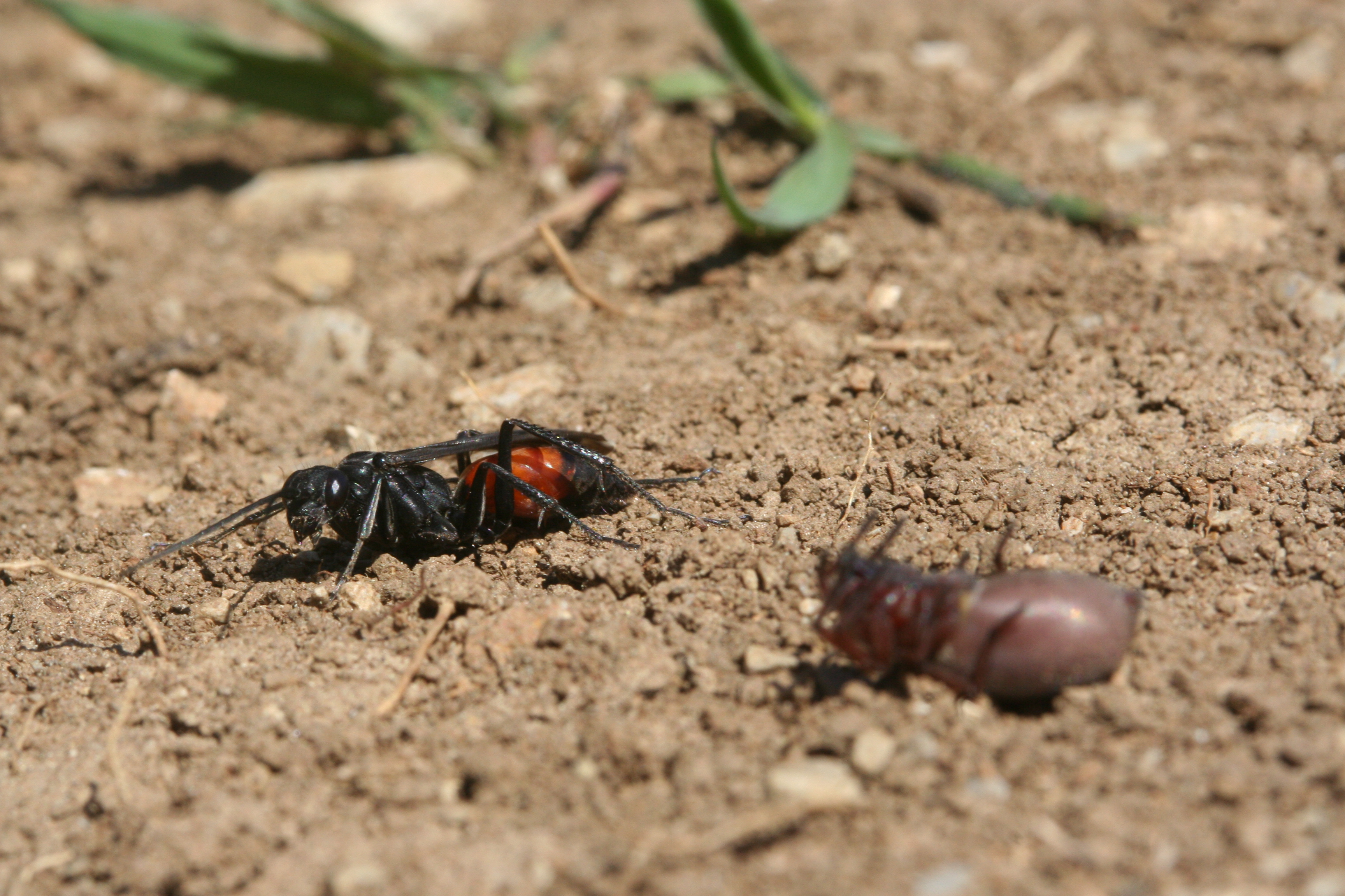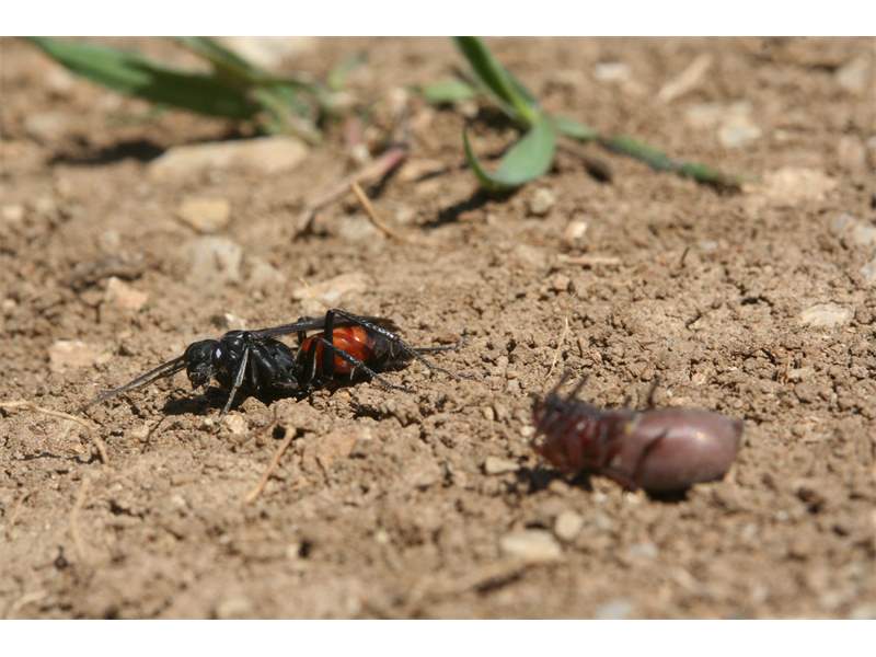 Weibchen von Anoplius infuscatus, kurz zuvor hat das Weibchen eine Spinne gelähmt. Nun kommt die Wegwespe zurück, prüft, ob die Spinne betäubt ist und transportiert sie schließlich zum Nest, Nationalpark Hainich, Mai 2011