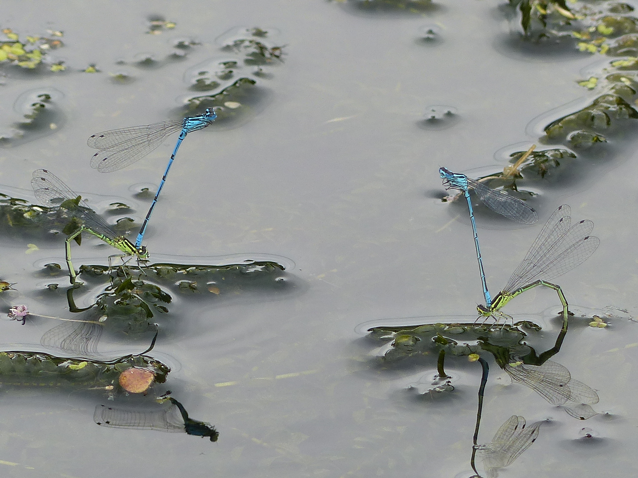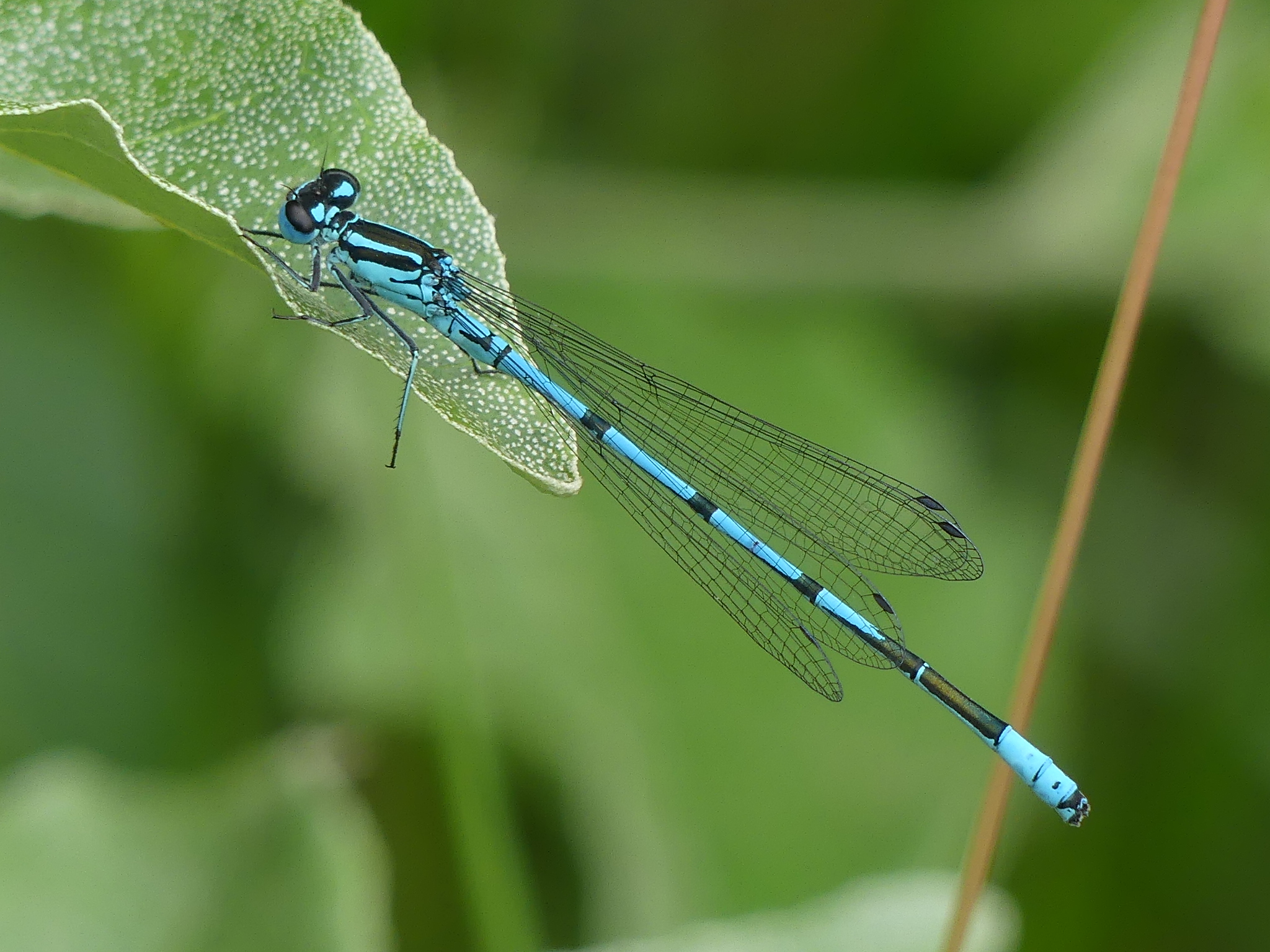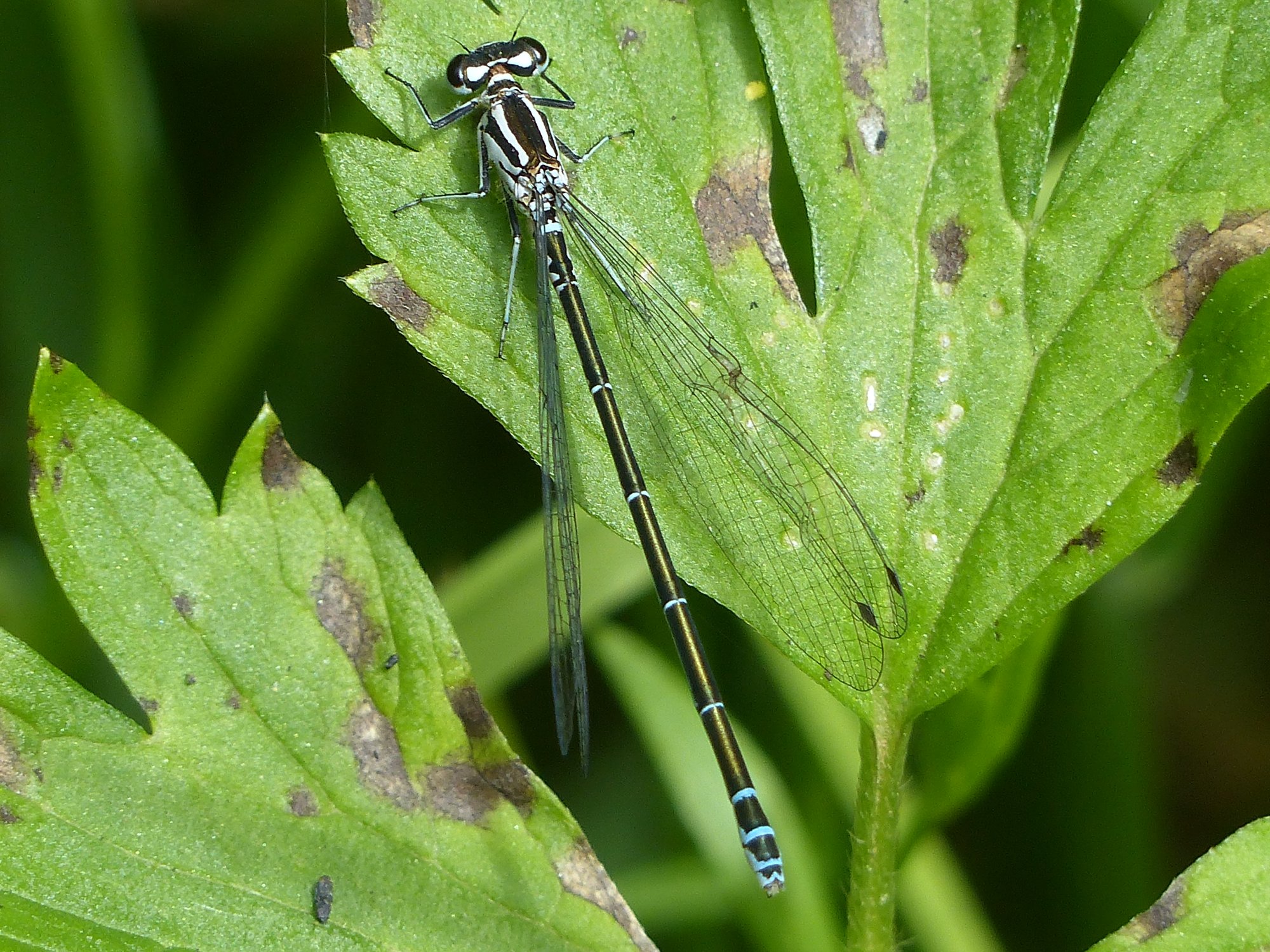 Hinterleib: Männchen mit blauer Grundfarbe, 2. Segment mit hufeisenförmiger, schwarzer Zeichnung, der Vorderrand dieses Merkmals ist rund ausgeschnitten und der Hinterrand in winkligen Ecken ausgezogen; schwarze Ringe an den Enden der Segmente 3 bis 6 mit seitlichen spitz auslaufenden Linien, die fast zur Segmentbasis reichen, Segmente 7 und 10 überwiegend schwarz, Segmente 8 und 9 überwiegend blau. Weibchen oberseits überwiegend schwarz, seitlich grünlich oder bläulich, 2. Segment mit auf beiden Seiten einfach ausgebuchtetem, schwarzen Zeichnungselement. Bei junge Individuen Grundfarbe blass rosa oder blass violett. Obere Anhänge der Männchen weit voneinander entfernt, kürzer als die unteren Anhänge.