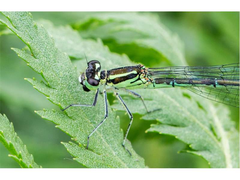 Thorax: Grundfarbe bei Männchen blau, bei Weibchen grün, selten blau, bei jungen Individuen blass rosa or blass violett; vollständige Antehumeralstreifen (Längsstreifen auf der Oberseite des mittleren Brustabschnitts), schwarzer Interpleuralstreifen (seitlicher Streifen am Thorax in mittlerer Höhe). Pronotumhinterrand (vorderer verschmälerter Brustabschnitt) gewellt, bei Männchen stärker als bei Weibchen, bei Weibchen oft teilweise farbig, Pronotum bei Männchen oft seitlich mit je einem blauen Fleck.