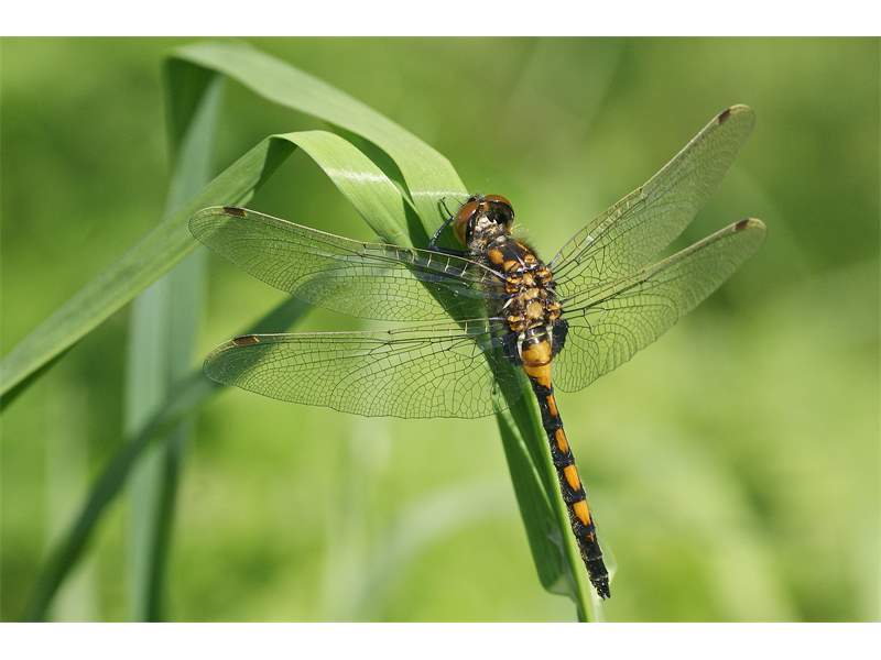 Hinterleib: Grundfarbe schwarz, oberseits farbige Flecke auf den Segmenten 2 bis 7, bei ausgefärbten Männchen orange, rot oder braun, bei Weibchen und jungen Individuen gelb, auf Segment 2 gelber Ring an Segmentbasis, Flecke auf den Segmenten 3 und 4 oft an Segmentbasis seitlich erweitert, Flecke auf den Segmenten 6 und 7 umfassen etwa Dreiviertel der Segmentlänge. Anhänge beider Geschlechter schwarz.