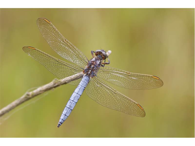 Thorax: Junge Individuen und Weibchen mattbraun, ausgefärbte Männchen können blau bereift sein. Beide Geschlechter mit auffällig hellen Antehumeralstreifen (Längsstreifen auf der Oberseite des mittleren Brustabschnitts) und großem hellbraunen Flügelmal. Zwischen Radiussektor (IR3) und Radialsupplementader (Rspl) nur eine Zellreihe mit maximal fünf Zellverdopplungen.