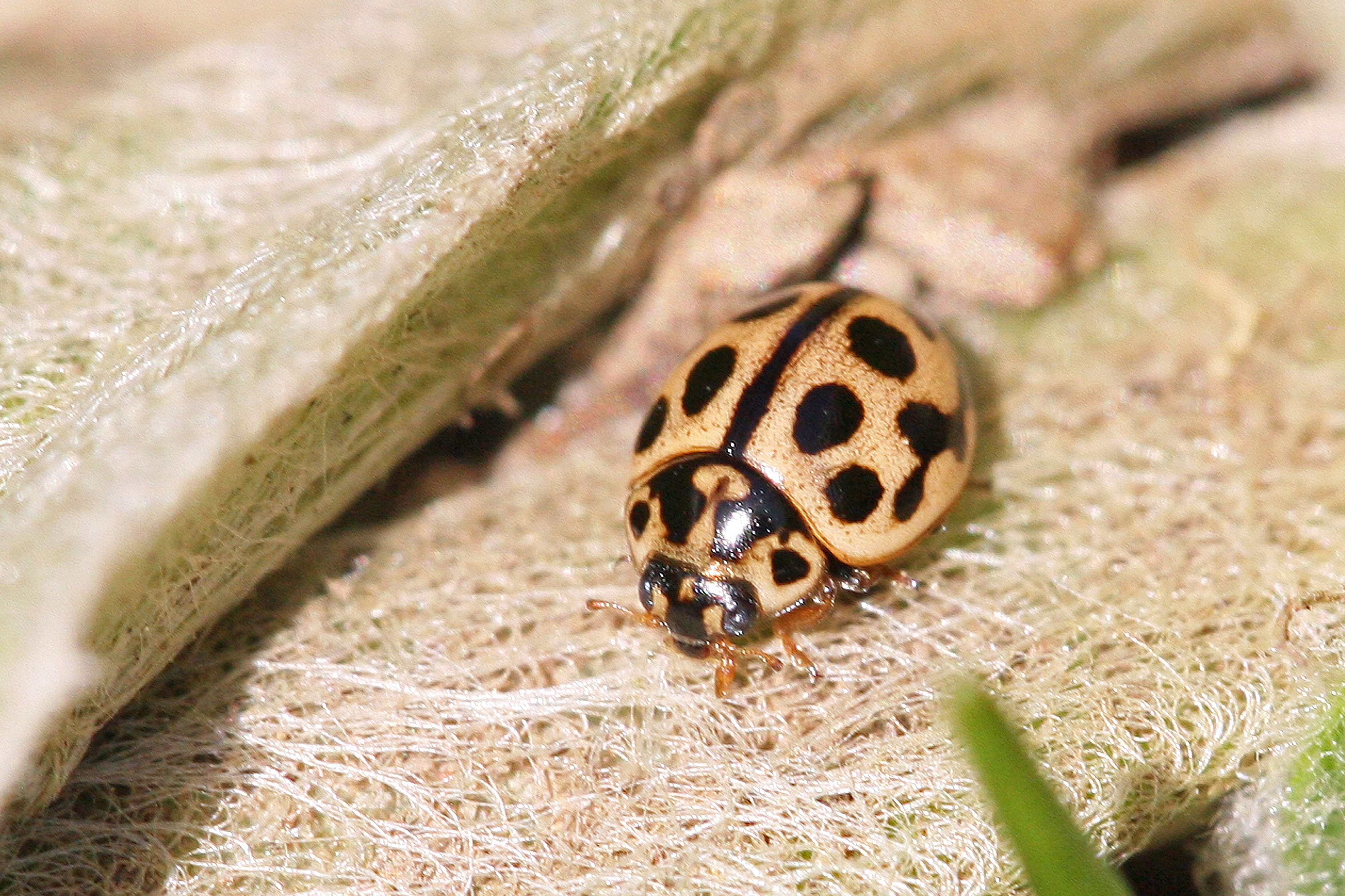 Thorax: Halsschild (Pronotum) in gleicher Farbe wie Deckflügel, mit 4 in einem Halbkreis angeordneten, ovalen, schwarzen Punkten, darin ein undeutlicher Punkt sowie seitlich je ein weiterer ovaler schwarzer Fleck. Deckflügel beige, gelb, rosa oder orange; jeder Deckflügel (Elytren) mit einer Reihe aus 4 schwarzen Punkten entlang der Flügeldeckennaht und seitlich mit einer Zick-Zack-Reihe aus 5 schwarzen Punkten, von denen 4 durch eine schwarze Längslinie miteinander verbunden sind; die Innenkanten der Flügel sind schwarz gerandet und bilden eine schwarze Flügeldeckennaht.