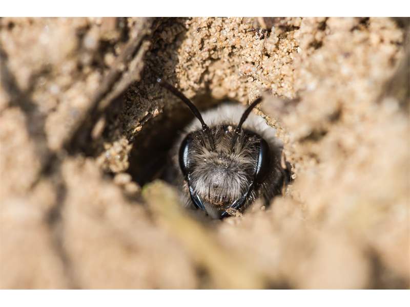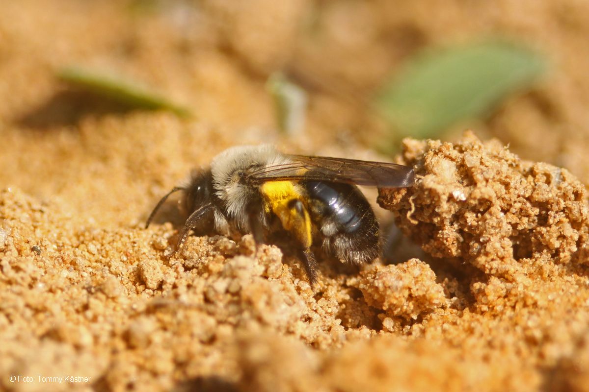 Weibchen der Weiden-Sandbiene in der Nähe ihres Nestes, gefunden bei Weißig im April 2013 (© Tommy Kästner)( Bild vergrößern)