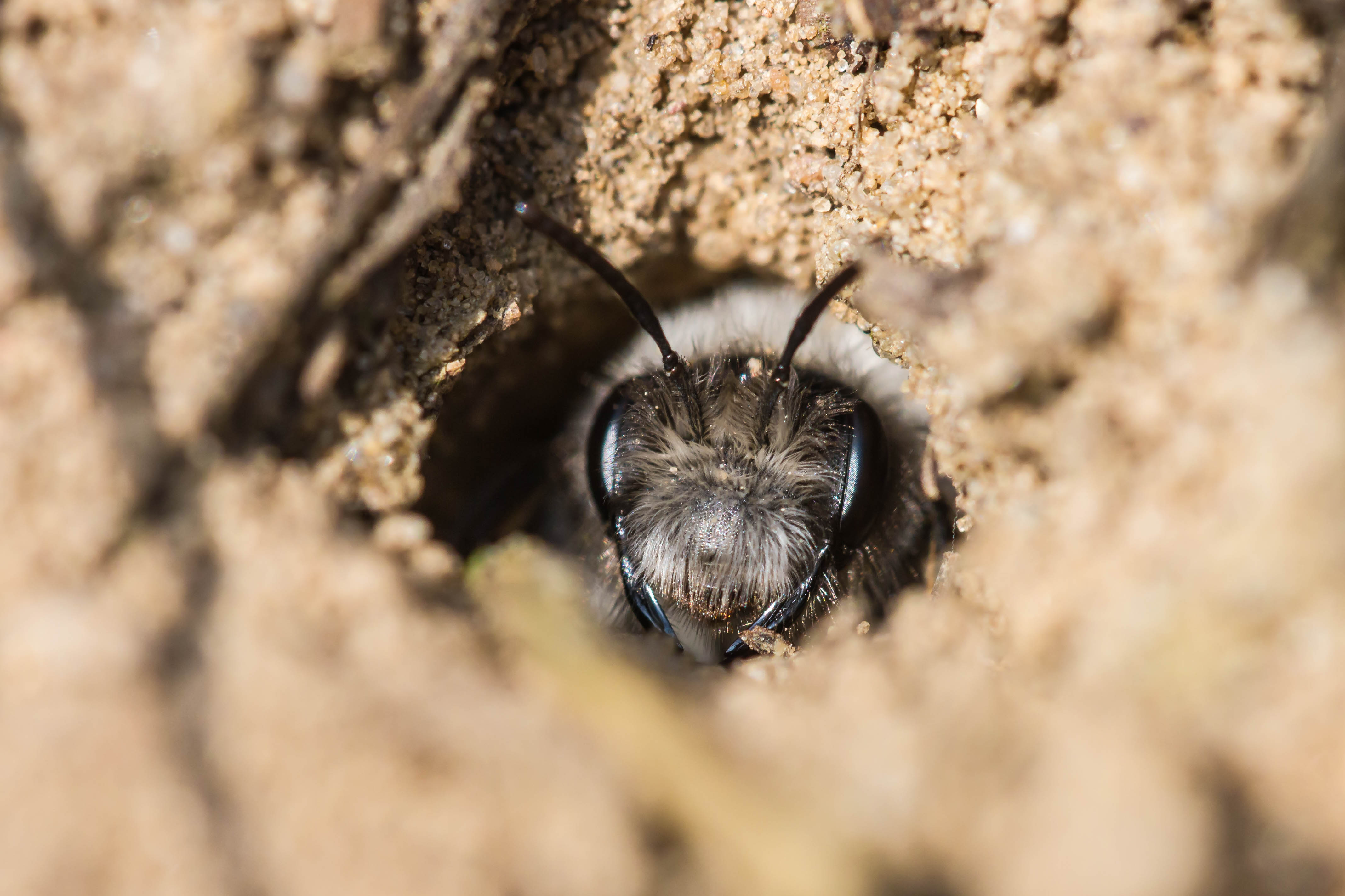 Weibchen der Weiden-Sandbiene in der Nähe ihres Nestes, gefunden bei Weißig im April 2013