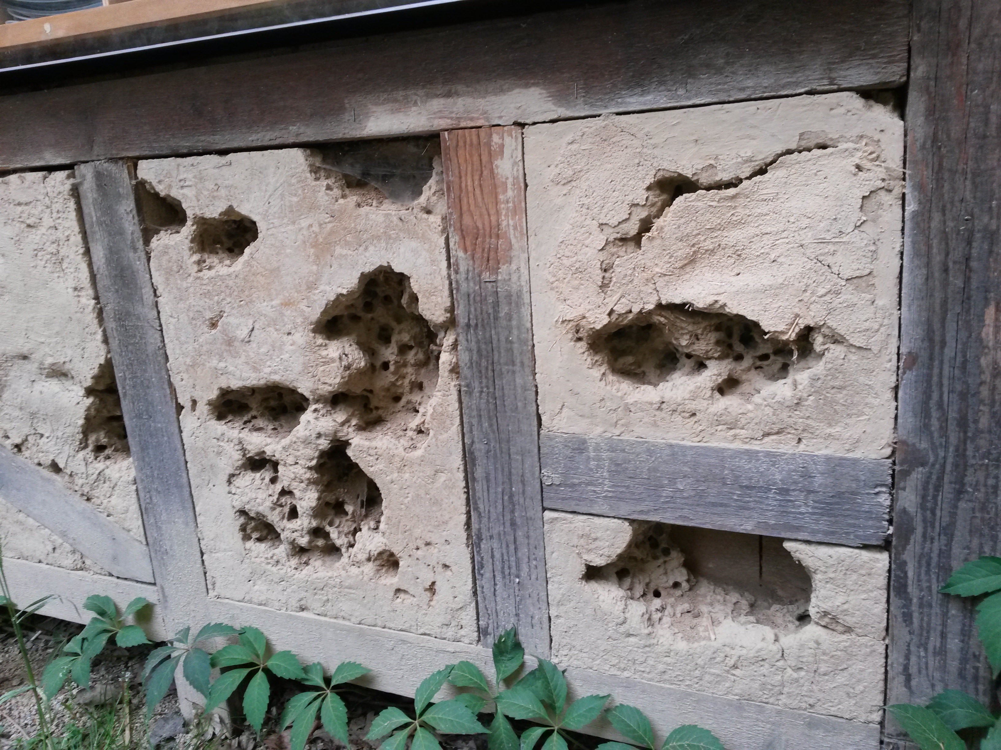 einem Fachwerk nachgebildete Nisthilfe für Wildbienen, besetzt mit A. plumipes, Großer Garten Dresden, Mai 2016
