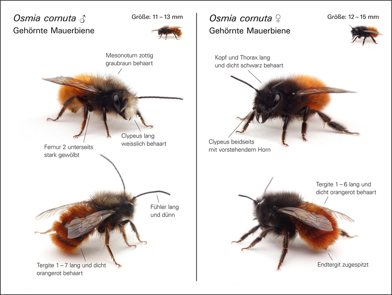 Diagnostische Merkmale von Osmia cornuta, Fundort beide: Dresdner Innenstadt, März 2015. (© Mandy & Michael Fritzsche)( Bild vergrößern)