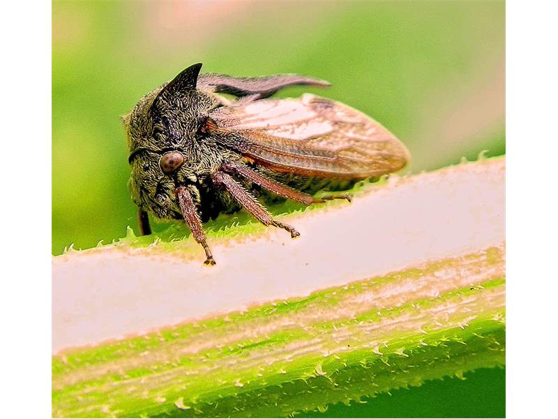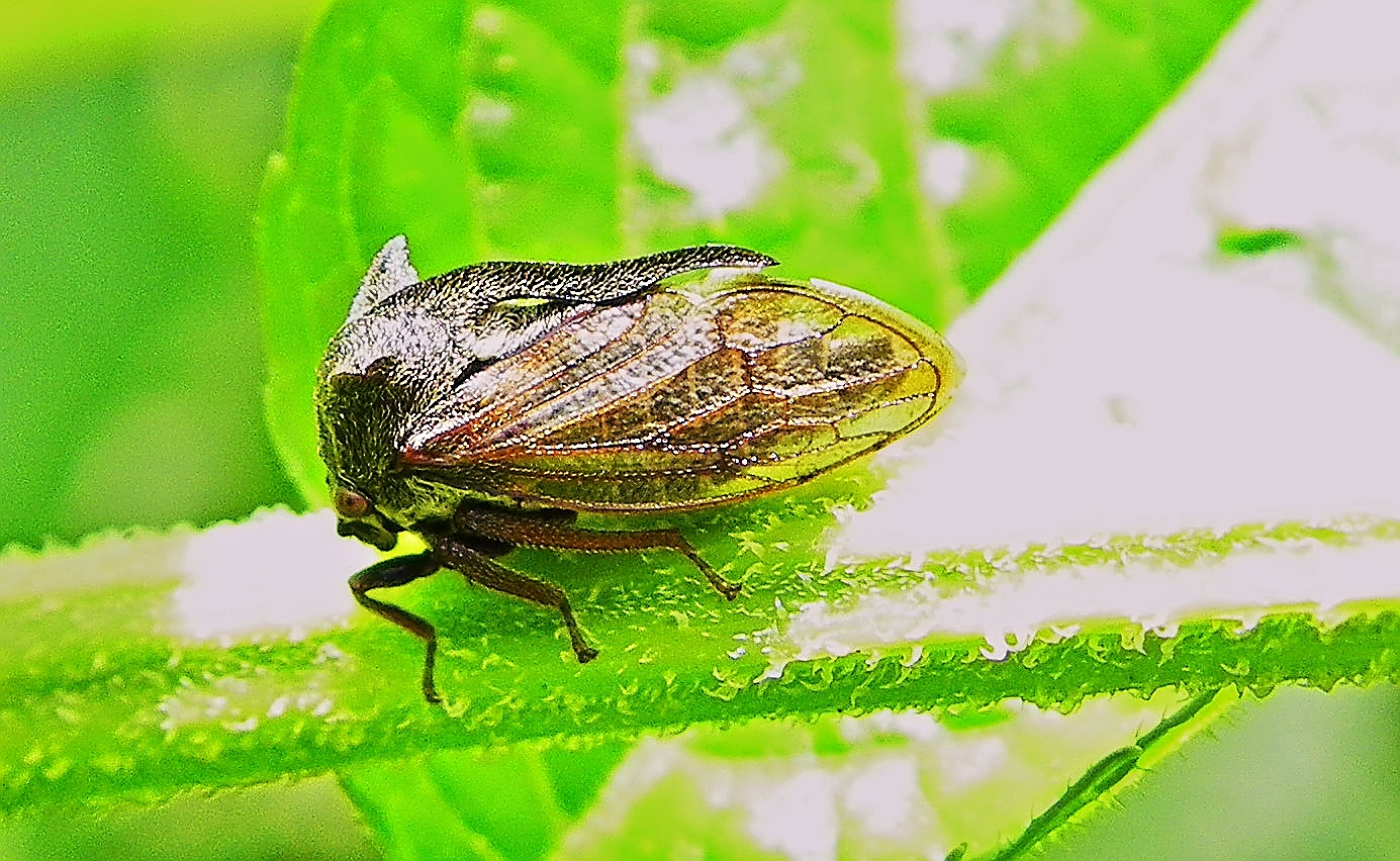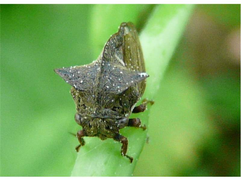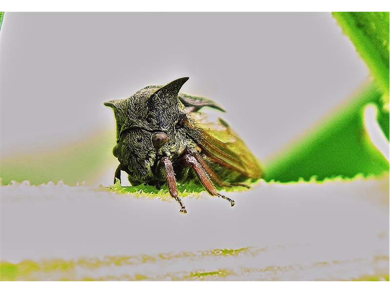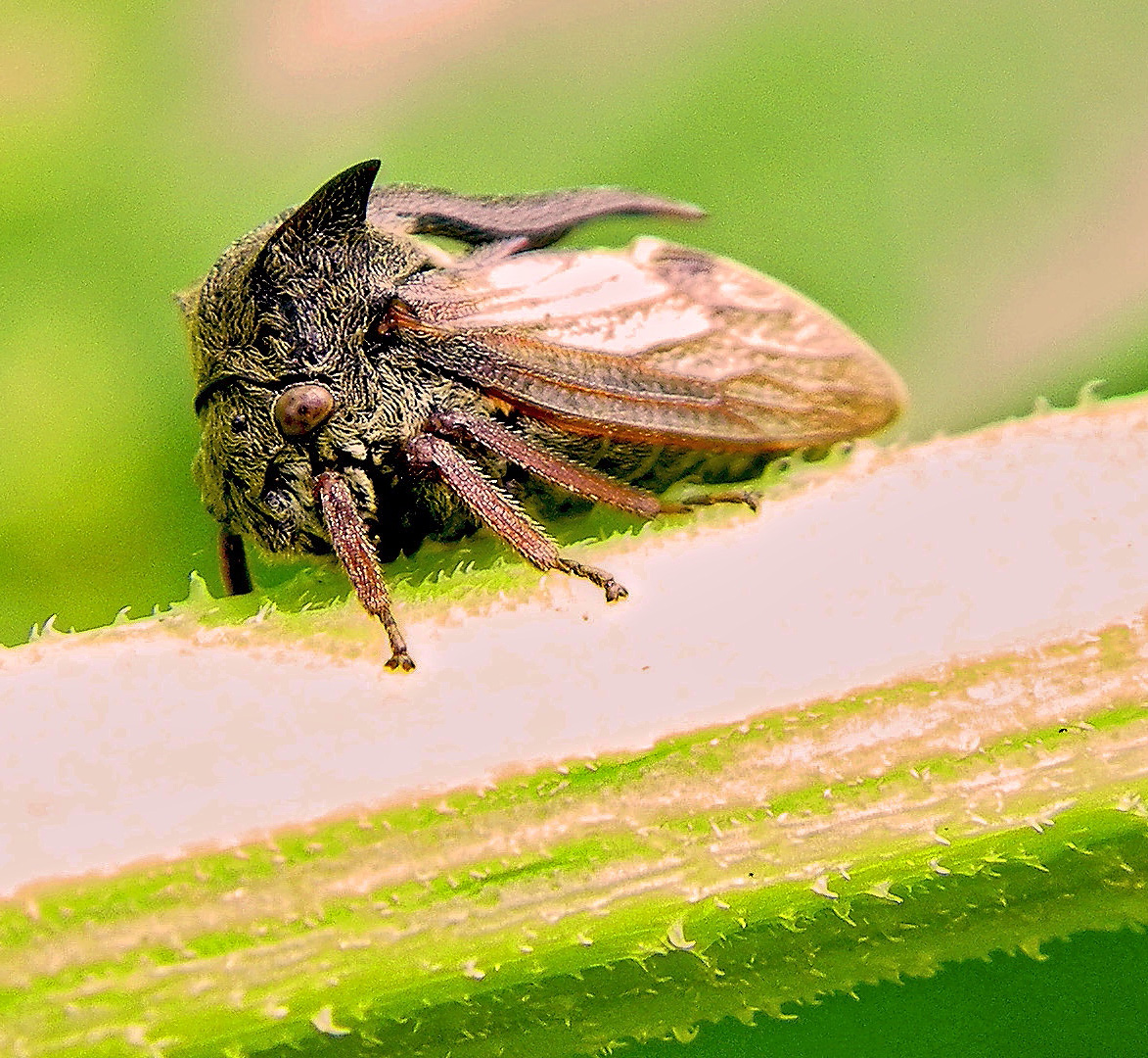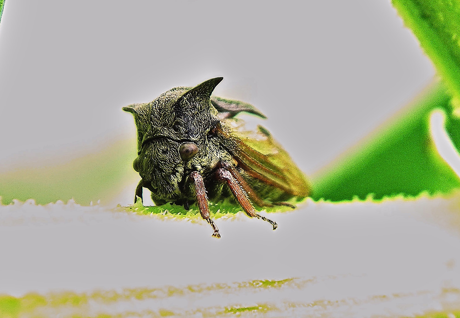 Gargara genistae. Die ebenfalls mit Hörnchen ausgestattete Büffelzikade