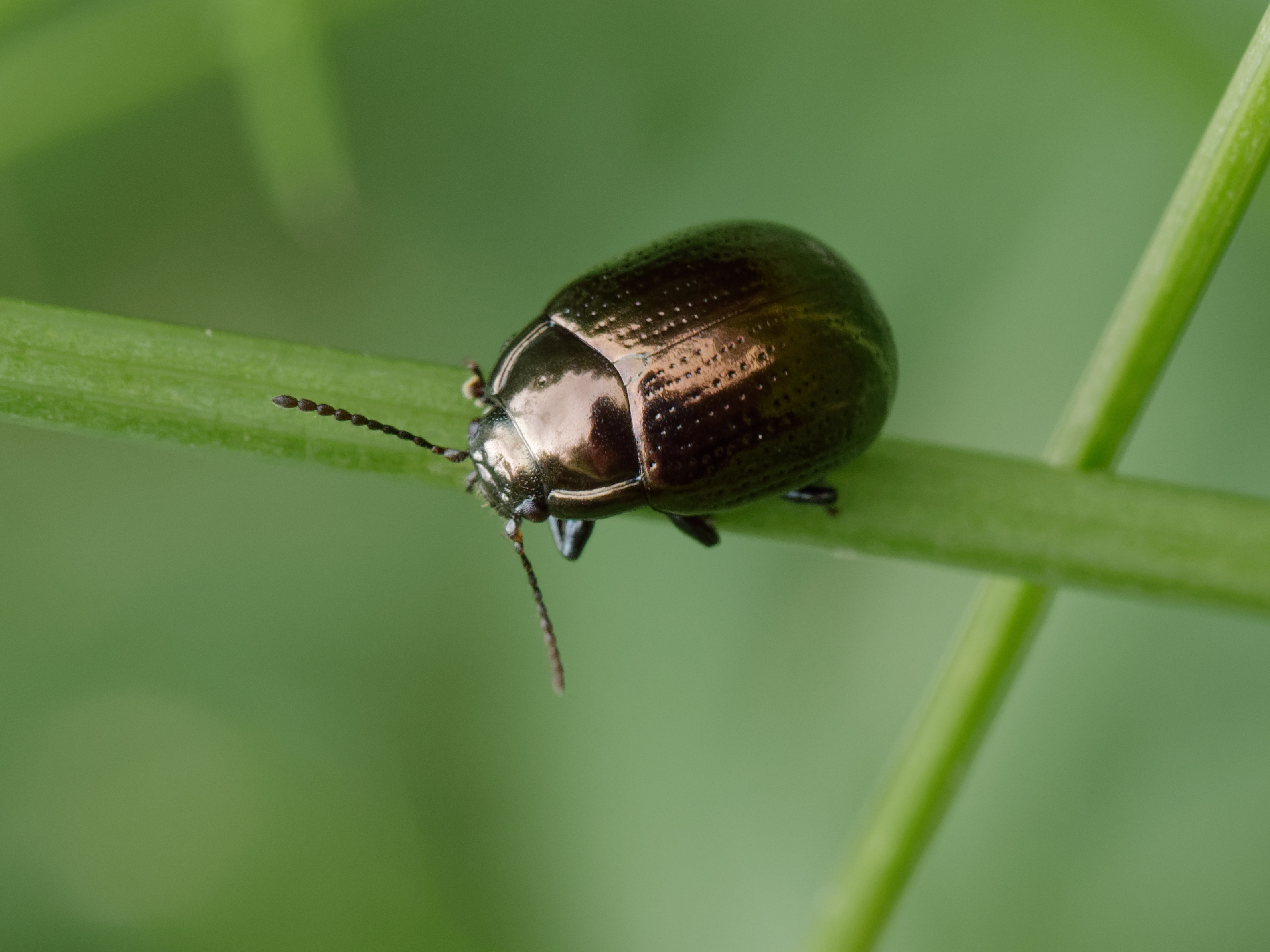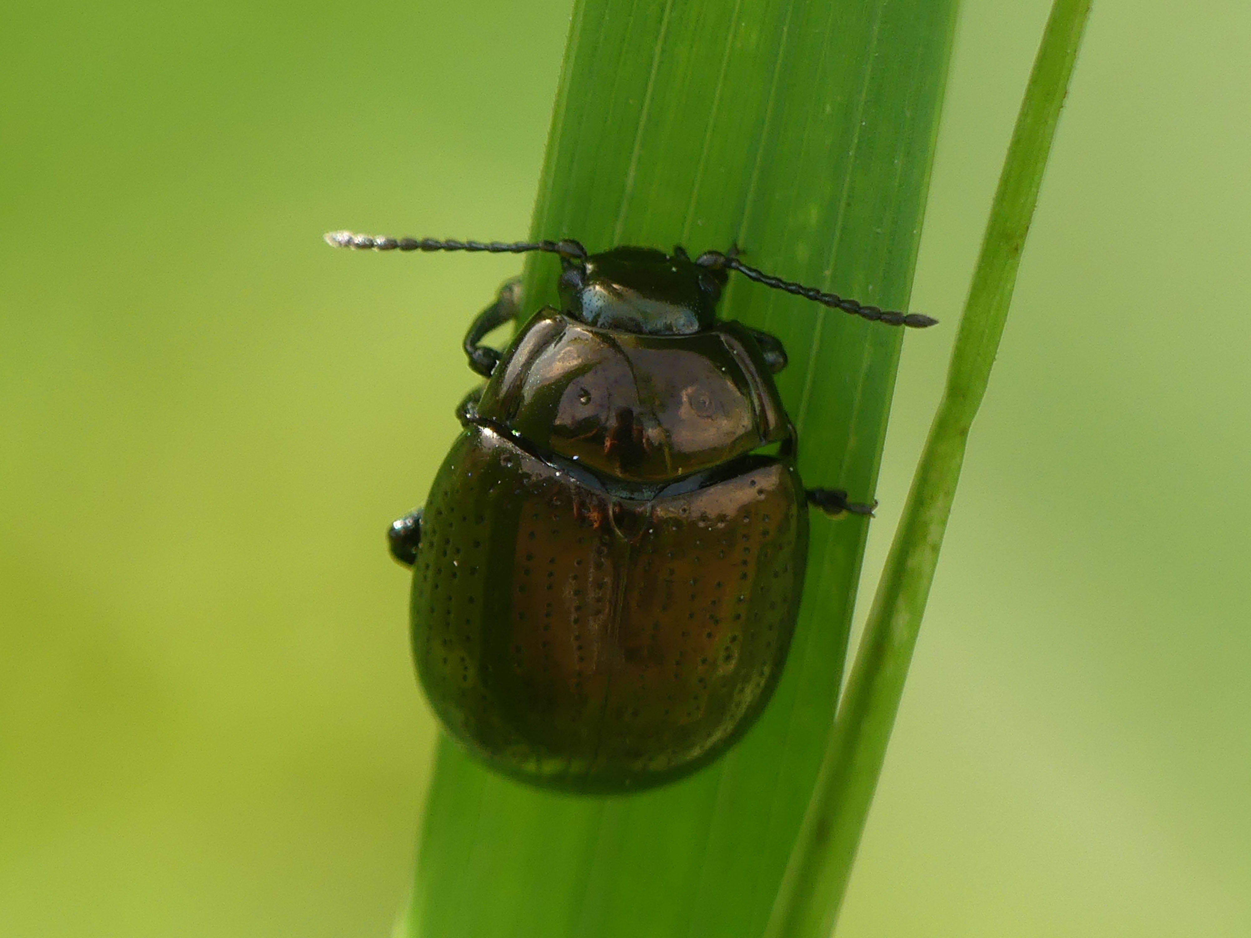 Kopf, Halsschild und Flügeldecken (Elytren) stark glänzend dunkelgrün bis bronzefarben.