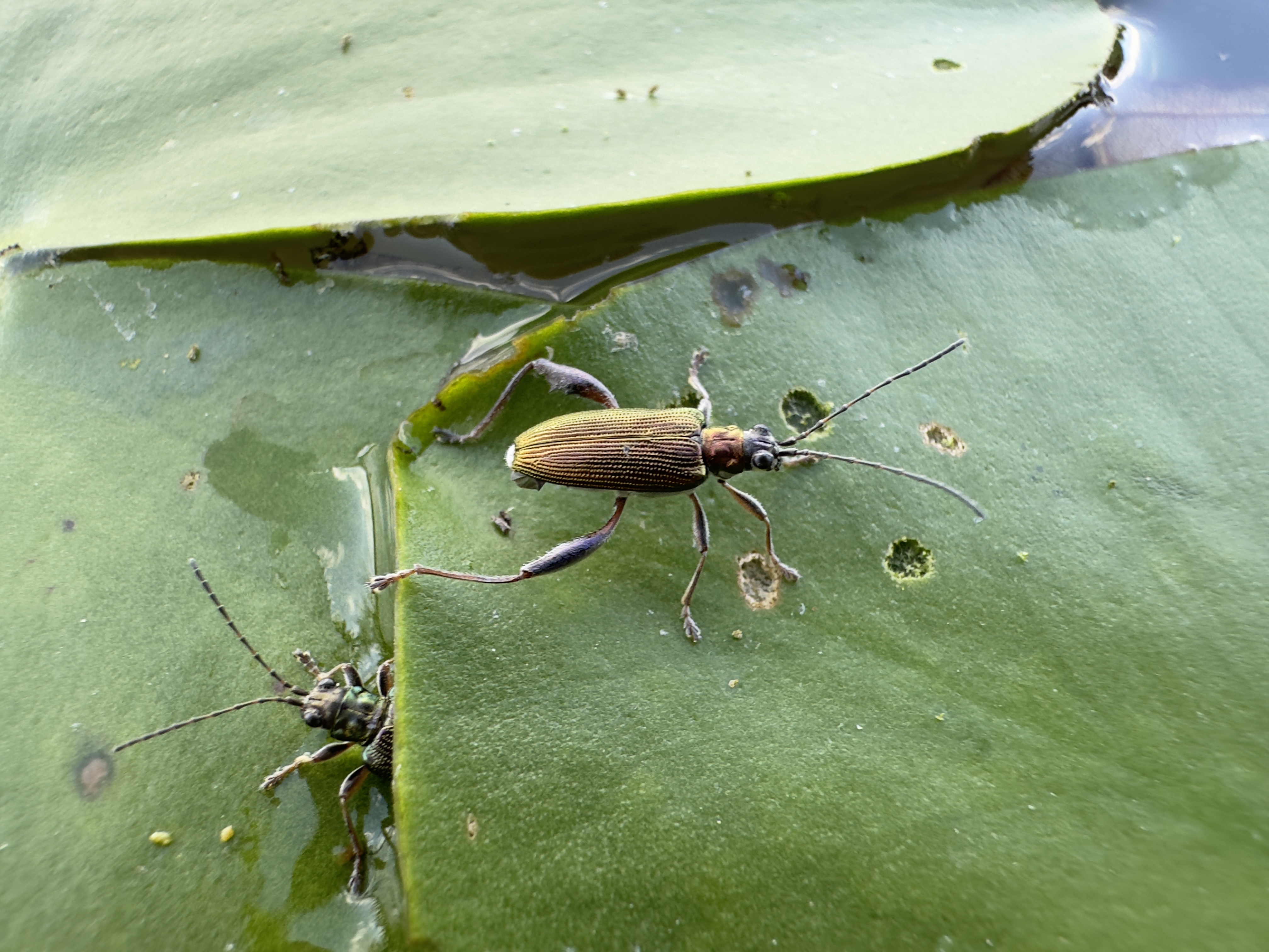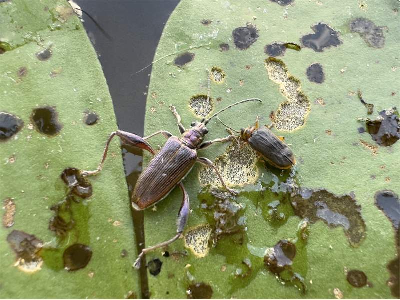 In der Spiegelung auf der Wasseroberfläche sind deutlich die zwei Zahne des Hinterschenkels zu erkennen. Rechts ein vermutlich von Wasserwanzen ausgesaugter Seerosen-Blattkäfer. Mazury / Masuren, Orzysz, August 2024 (© Matthias Nuß)( Bild vergrößern)