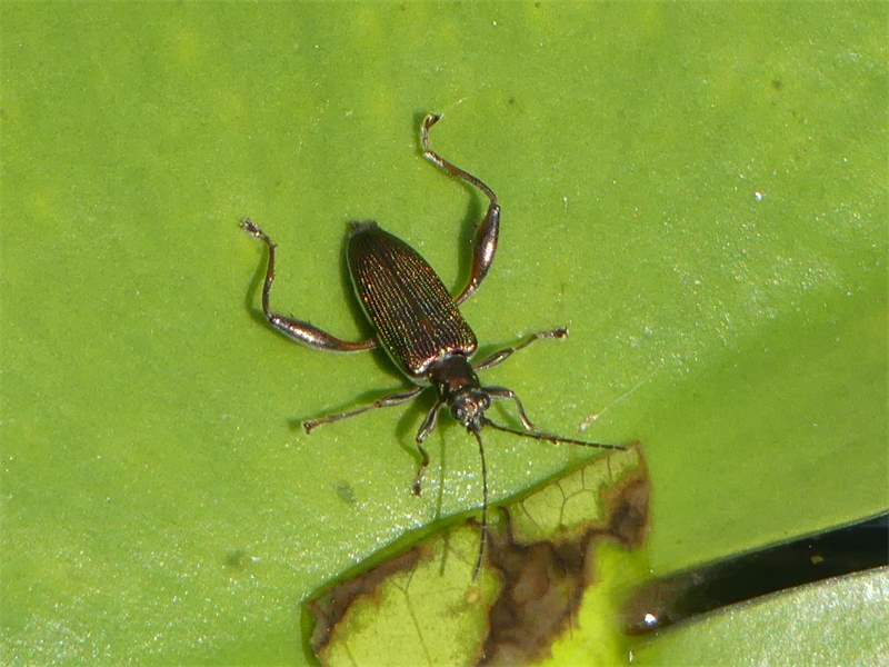 In der Spiegelung auf der Wasseroberfläche sind deutlich die zwei Zahne des Hinterschenkels zu erkennen. Rechts ein vermutlich von Wasserwanzen ausgesaugter Seerosen-Blattkäfer. Mazury / Masuren, Orzysz, August 2024