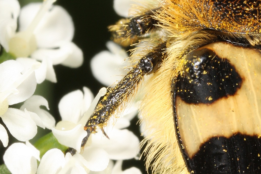 Thorax: Halsschild schwarz, gelb (Männchen) oder braun (Weibchen) behaart. Flügeldecken (Elytren) gelbbraun, mit jeweils drei schwarzen Querflecken, dieses Muster aber sehr variabel. Vorderschiene (Protibia) vor dem Ende am Außenrand mit zwei Zähnen. Männchen mit schmalen Vorderschienen, 1. Tarsenglied groß, die Außenecke gerundet; Mittelschiene (Mesotibia) am Hinterrand ohne Zahn. Weibchen mit breiten Vorderschienen, 1. Tarsenglied klein, die Außenecke zugespitzt.