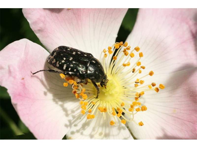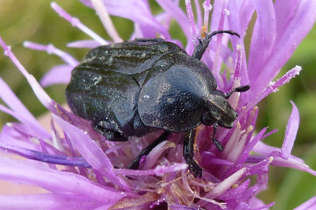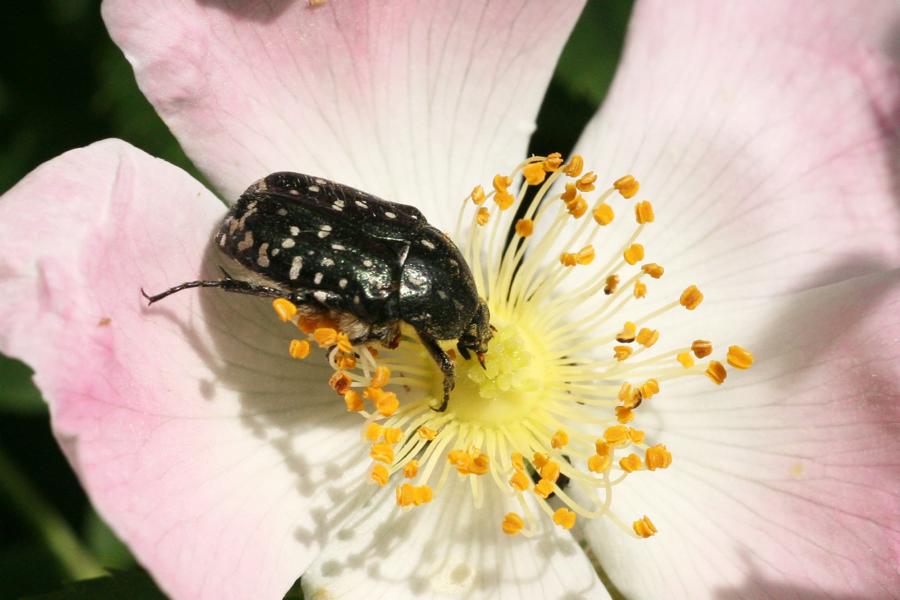 Kleiner, dunkel gefärbter Rosenkäfer.