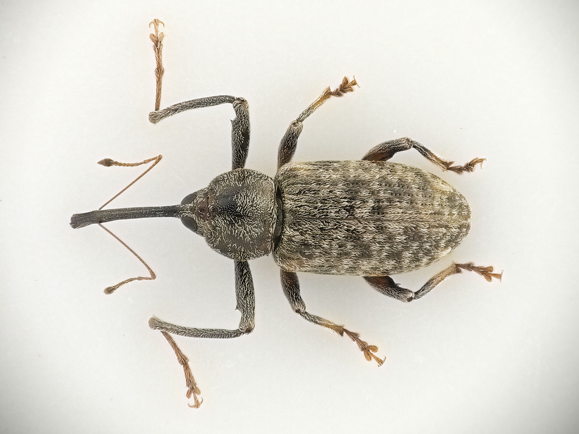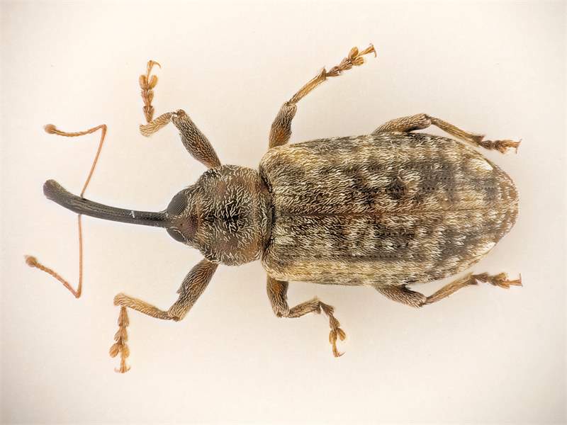 Käfer 4,5–7,5 mm lang. Farbvariationen von dunkelbraun bis hell rötlichbraun. Fühler deutlich gekniet, die Keule stets dunkel; erstes und zweites Geißelglied zusammen nicht länger als die restliche Fühlergeißel. Rüssel kahl, glänzend, mit Punktreihen und deutlich gebogen, länger als Kopf und Halsschild zusammen; Rüsselbasis und Stirn bilden zueinander einen ganz leichten stumpfen Winkel. Halsschildvorderrand an den Seiten bewimpert; Vorderbrust am Vorderrand nur leicht gebogen, ohne eckigen Ausschnitt; Vorderbrust vor den Vorderhüften länger als der Durchmesser der Vorderhüften (Seitenansicht); Behaarung der Flügeldecken fleckig-hellgrau. Charakteristisch sind die verlängerten Vorderschenkel der Männchen, bei einigen Individuen ist dieses Merkmal jedoch weniger ausgeprägt. Penis glatt mit glänzender Spitze, ohne Borsten.