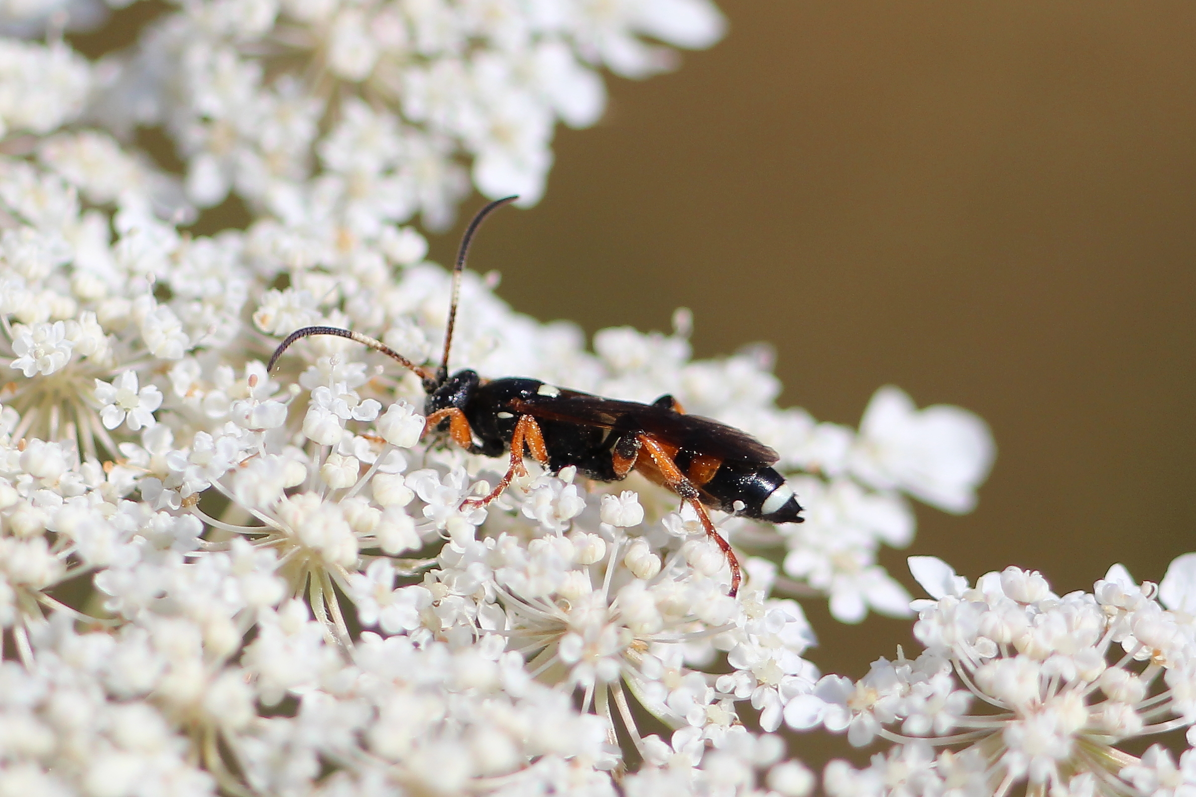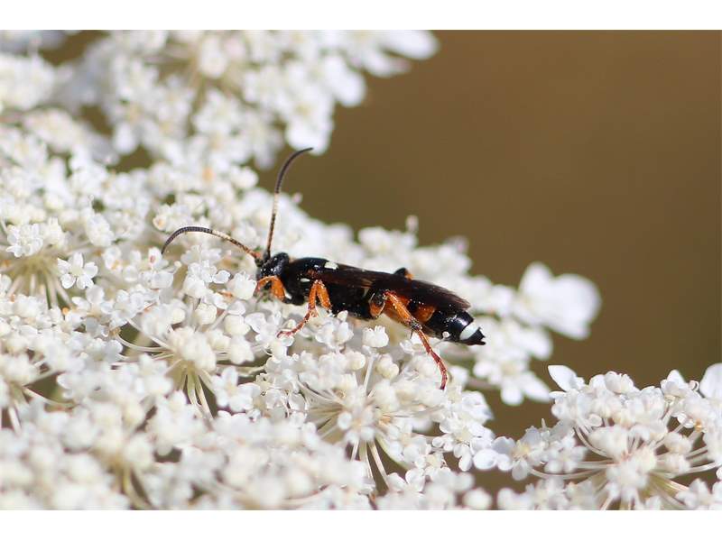 Thorax: Metathorax mit hellgelbem Trapez. Beine der Männchen gelb, der Weibchen orange; in beiden Geschlechtern Hinterschenkel- und schienen am Ende schwarz.
