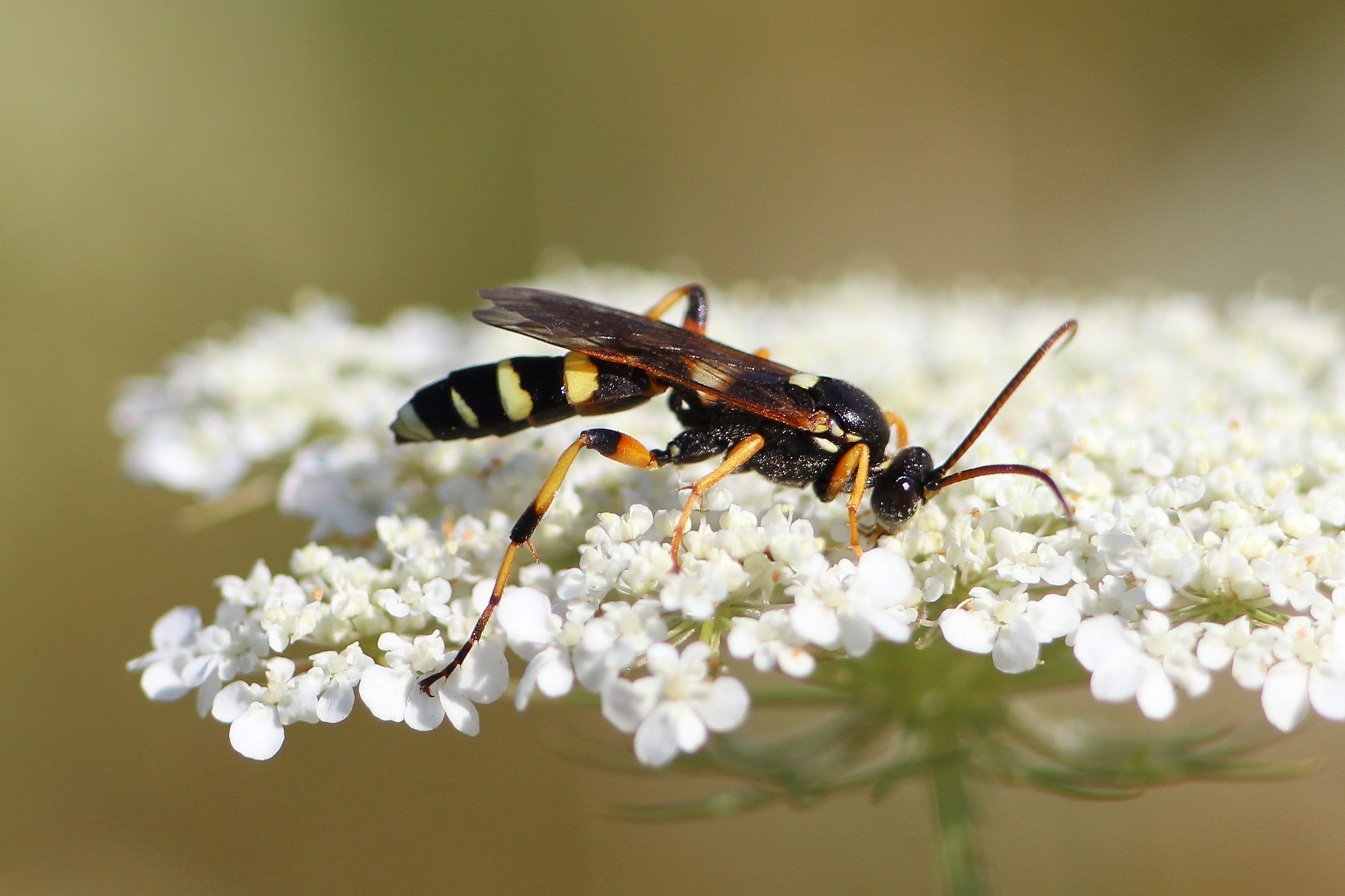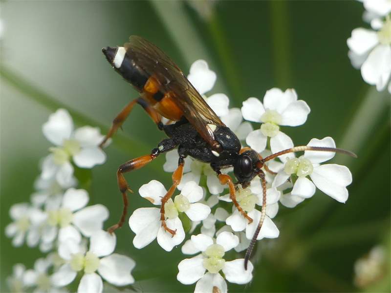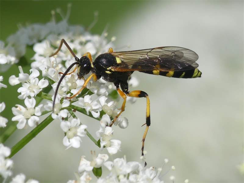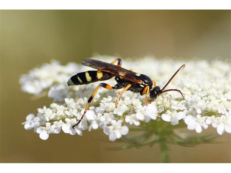 Hinterleib: schwarz; Gaster des Männchens vorn mit zwei gelben Binden, die in der Mitte eine V-förmige Einkerbung aufweisen, die dritte gelbe Binde in der Mitte vollständig unterbrochen und Hinterleibsspitze gelb; Weibchen mit einer breiteren, gefolgt von einer schmaleren orangen Binde und einem weißen Streifen vor der Hinterleibsspitze.