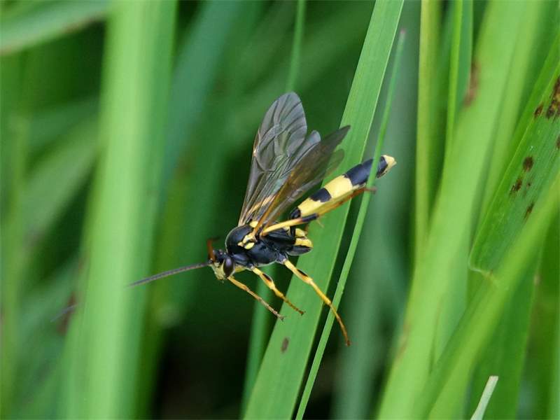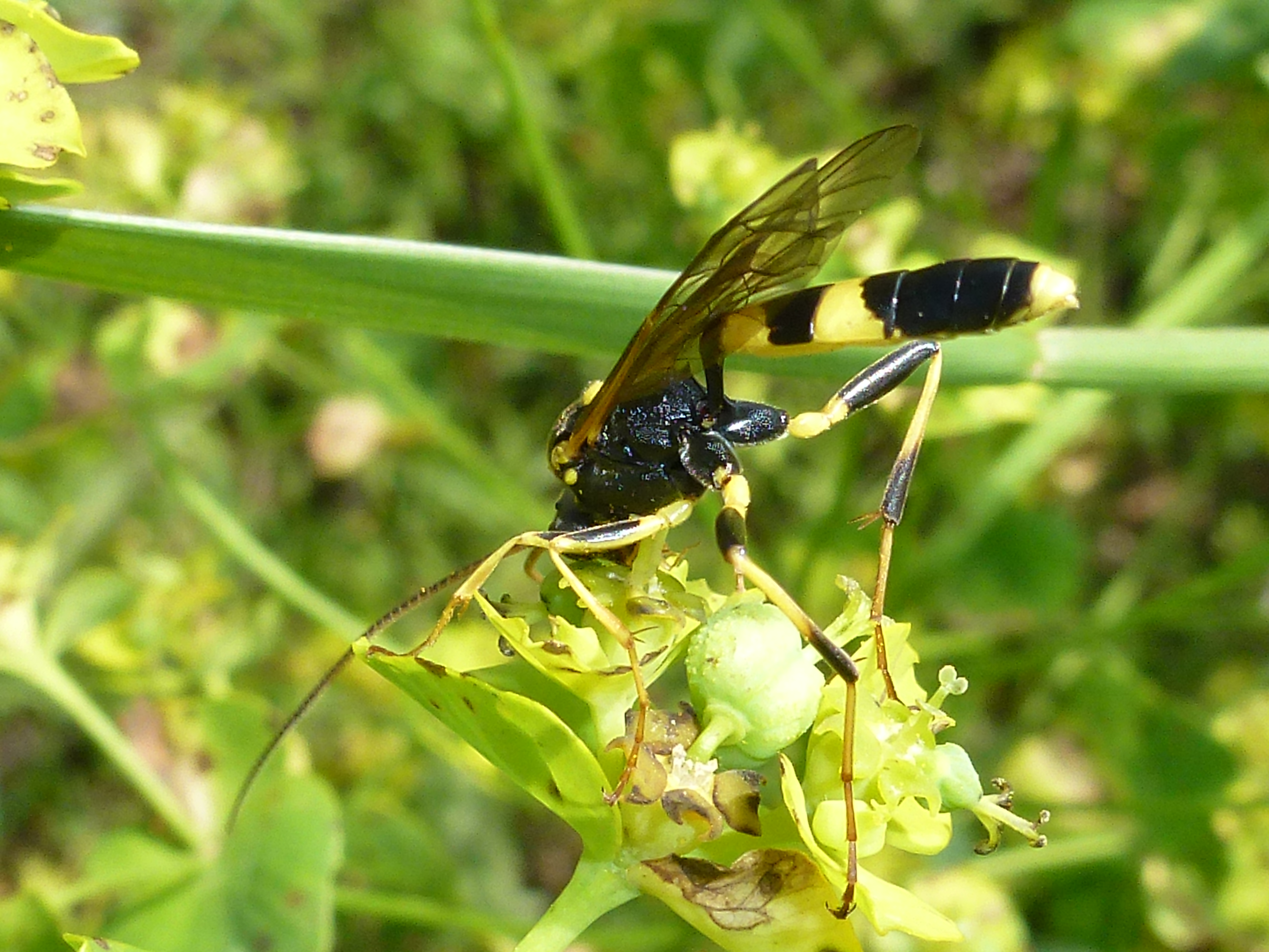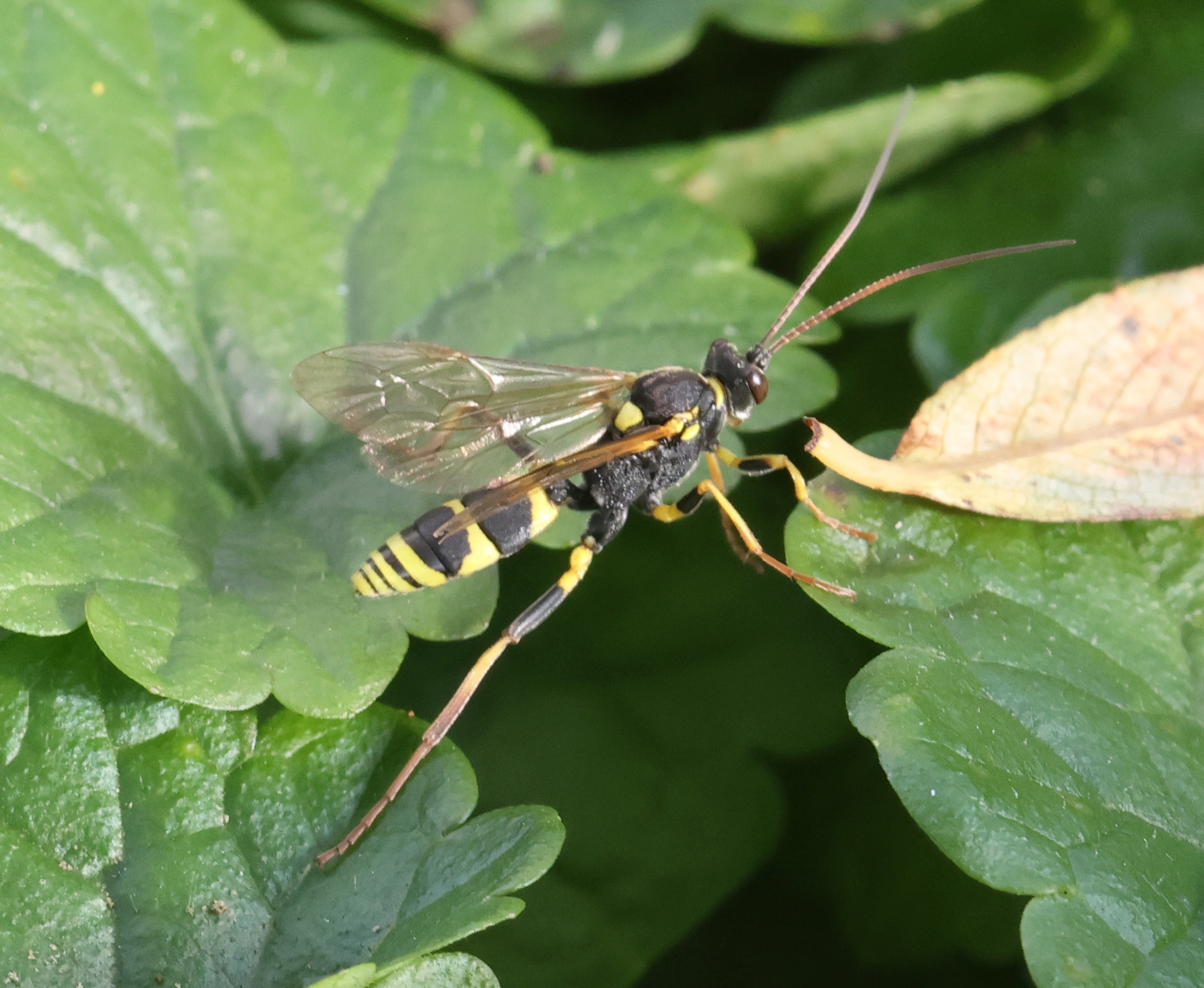 Hinterleib: schwarz; Gaster des Männchens vorn mit zwei breiten gelben Bändern und Hinterleibsspitze gelb; Weibchen vorn mit zwei dünnen gelben Bändern, die seitlich breiter werden, gefolgt von schmalen gelben Bändern.