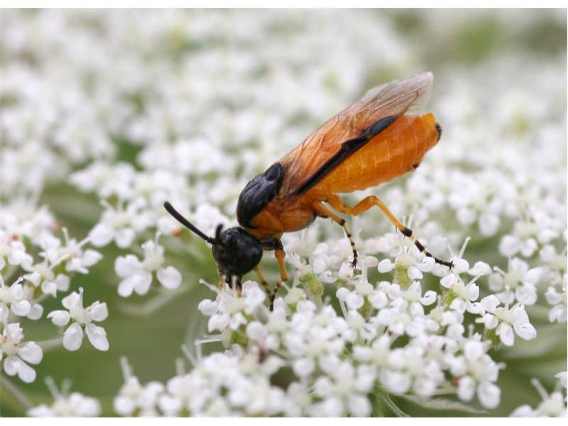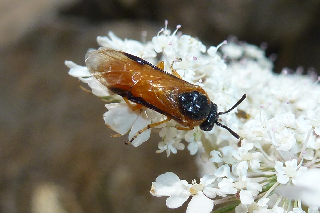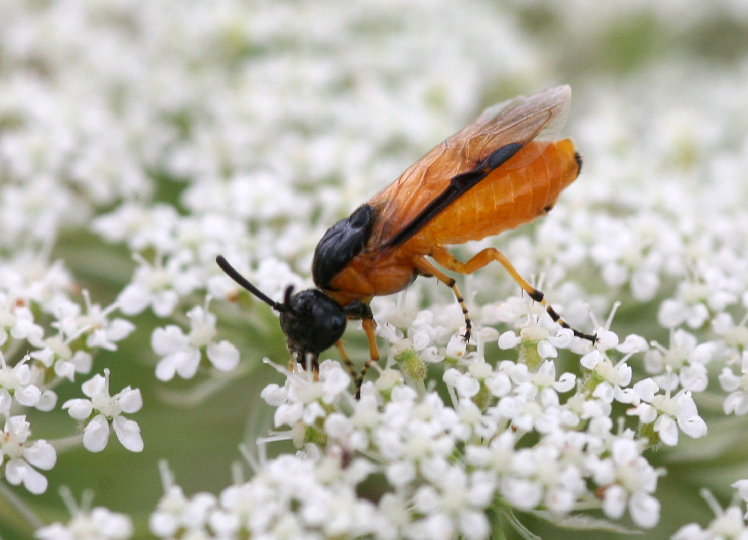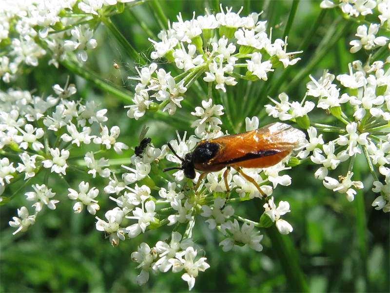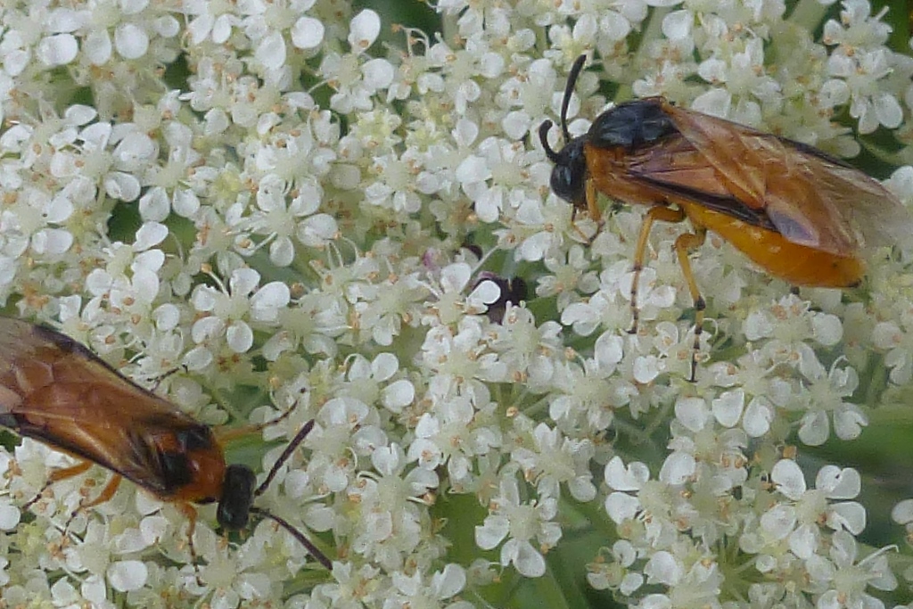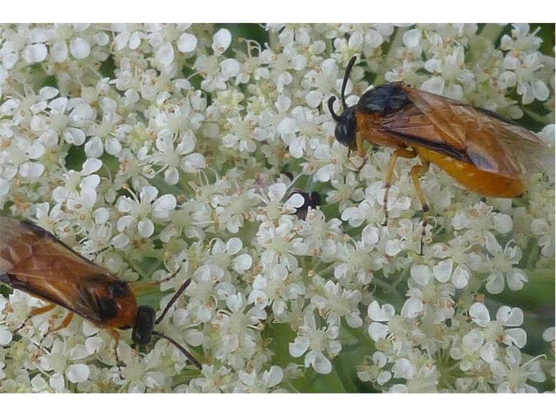 Rübsenblattwespe (Athalia rosae) (links) und Rosen-Bürstenhornblattwespe (Arge ochropus) (rechts) im Juli 2017 bei Ederheim (Bayern)