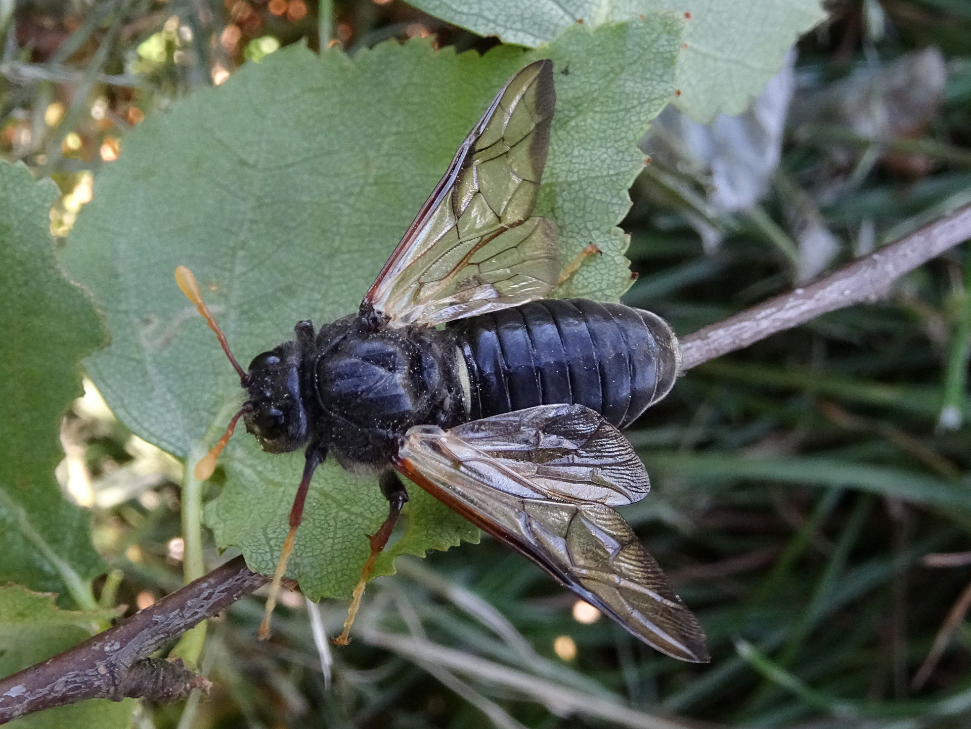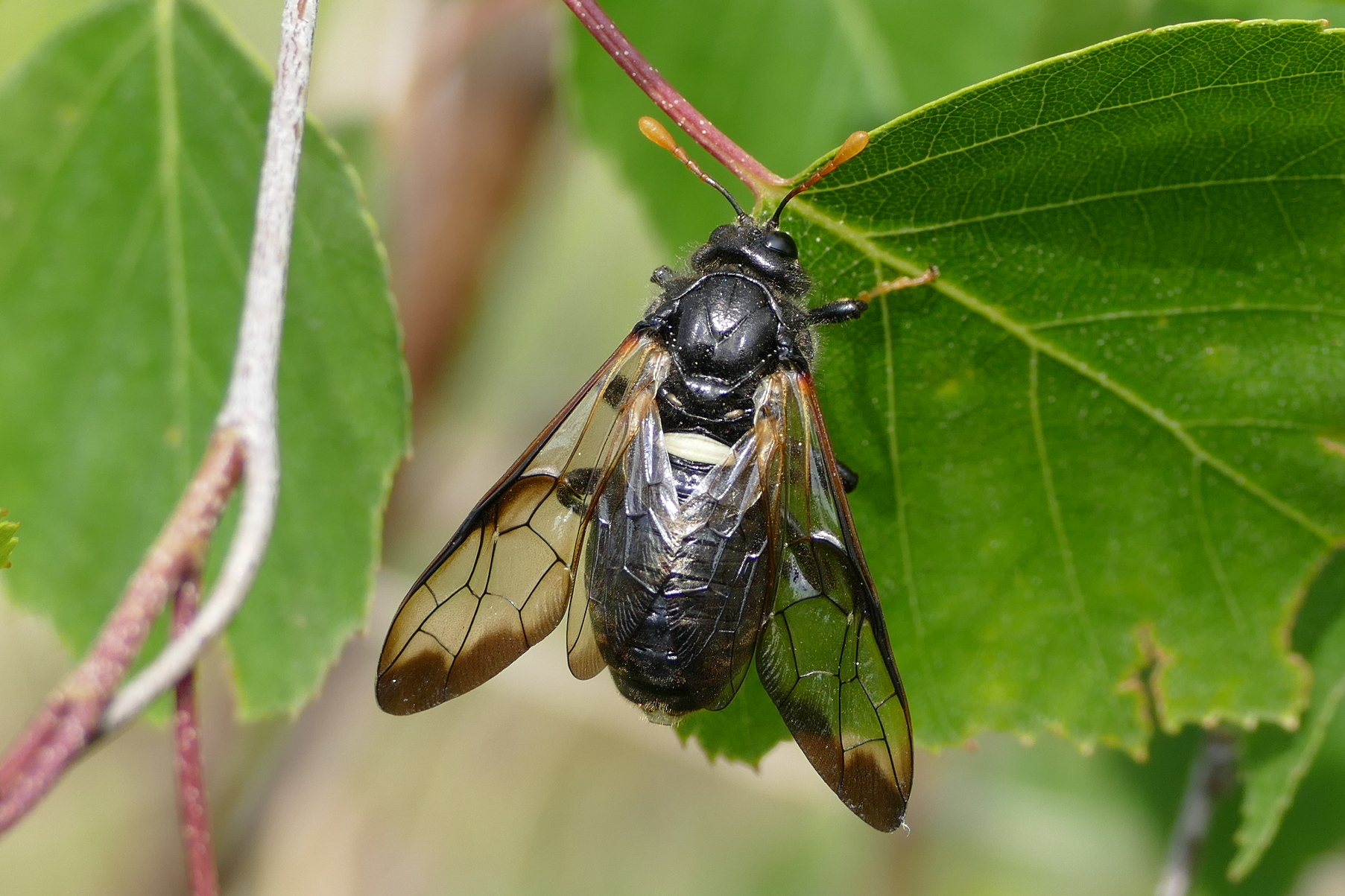 Thorax: schwarz glänzend, Beine schwarz, Tarsen orange; Flügel am Außenrand schwarz.