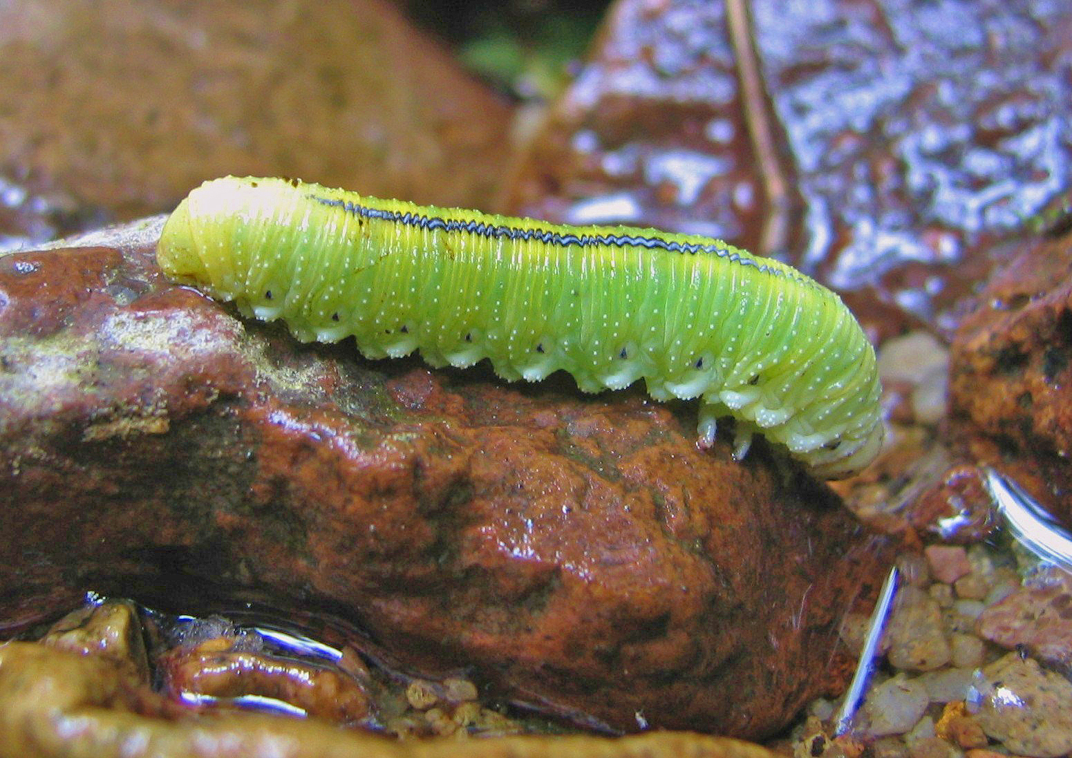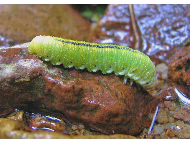 Die Larven sind hellgrün, mit vielen kleinen weißlichen Warzen besetzt und einem schwarzen Rückenstreifen.