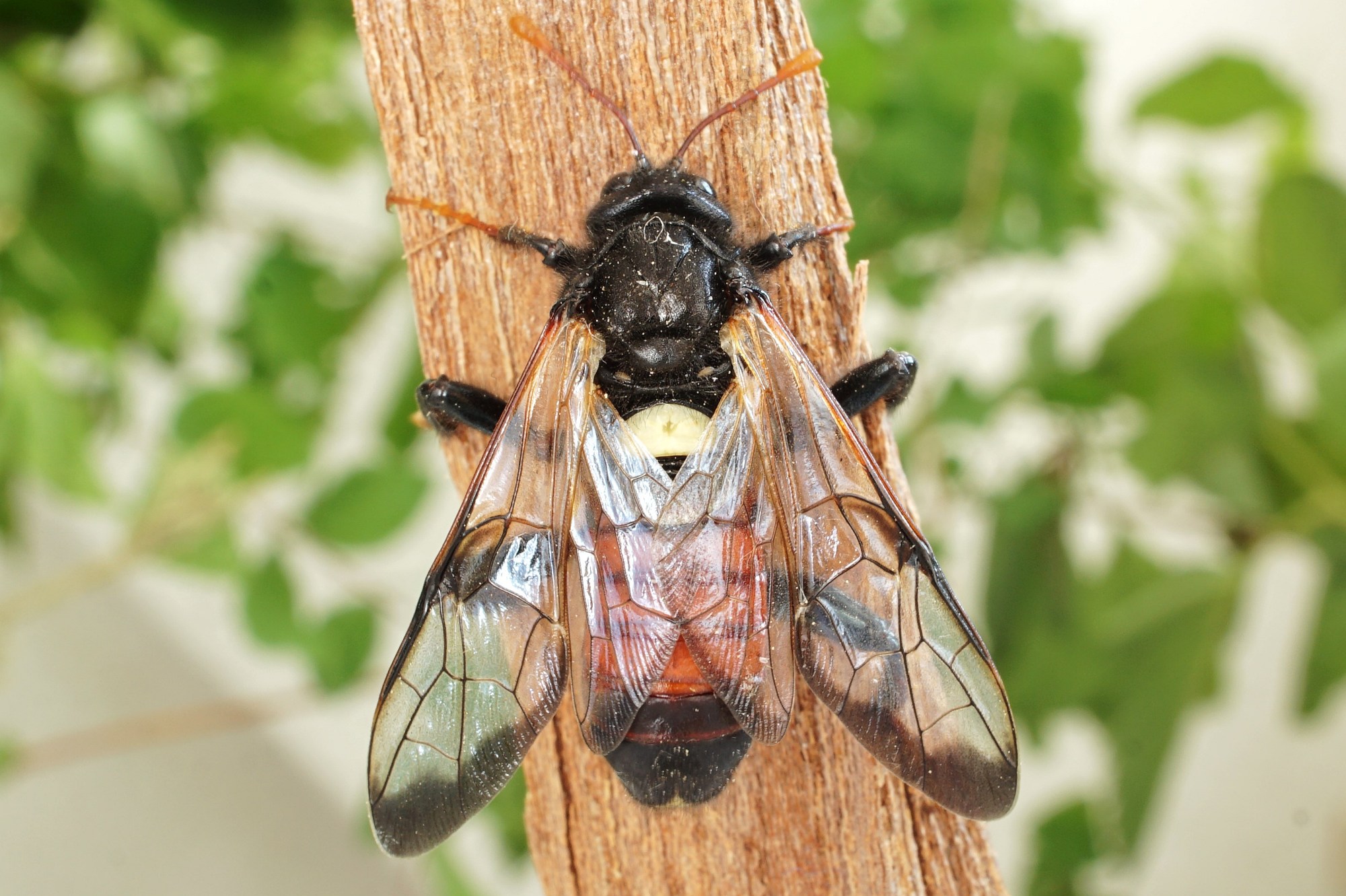 Hinterleib: rotbraun (Männchen) oder schwarz (Weibchen); erstes Tergit mit großem weißen oder hellgelben Fleck. Manche Individuen mit gelb und schwarz geringeltem Hinterleib.