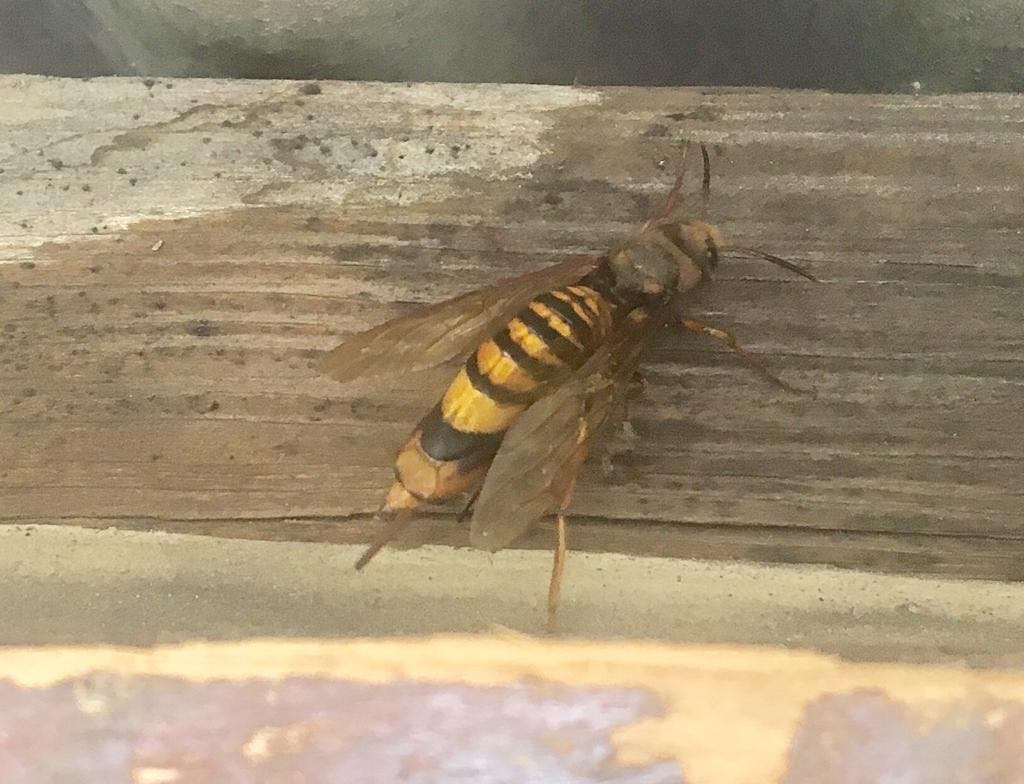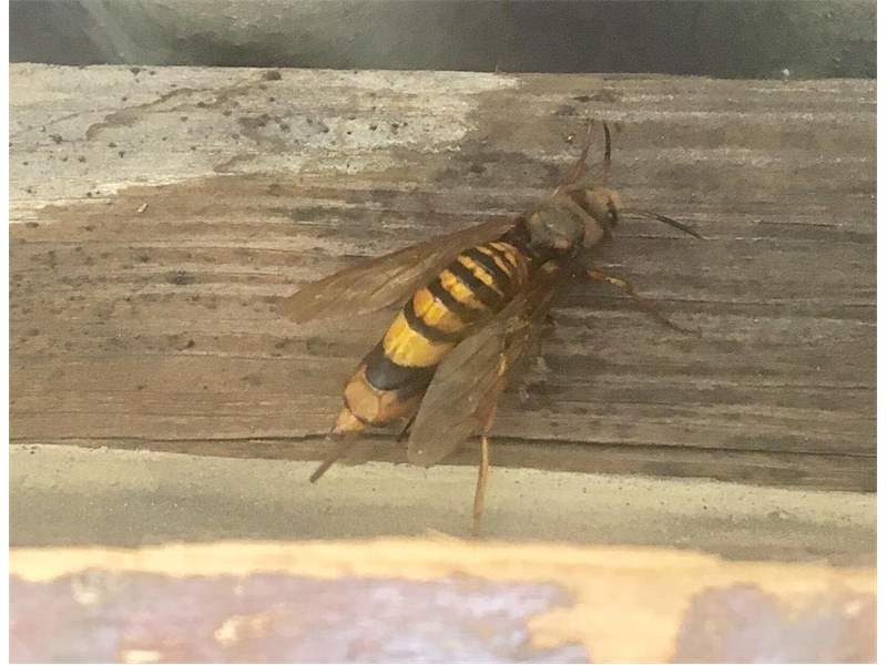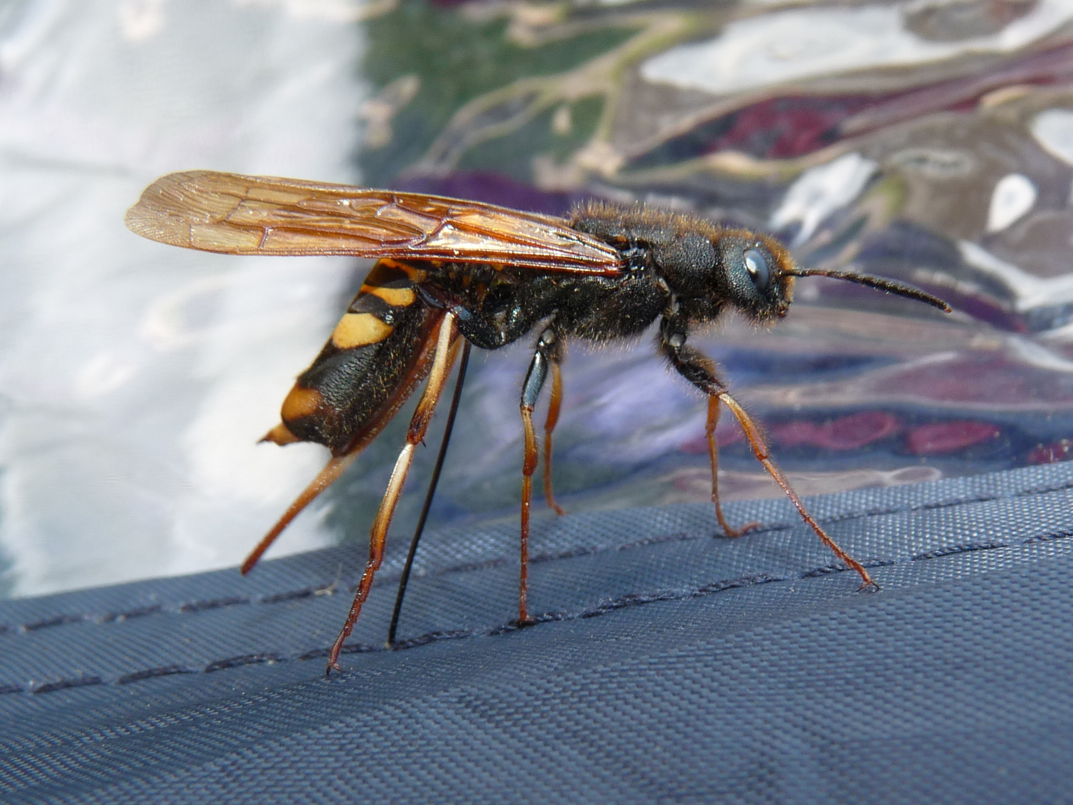 gelbe Kurzfühlerholzwespe Tremex fuscicornis bei der Eiablage an unserem Zelt, Rothenburg in der Lausitz, 02.09.2009
