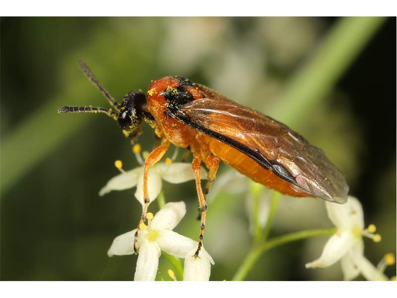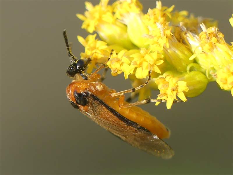 Thorax: in der Mitte (Mesonotum und Mesoscutellum) orange, seitlich schwarz. Vorderrand der Vorderflügel schwarz. Tibien (Schienen) am apikalen Ende schwarz.