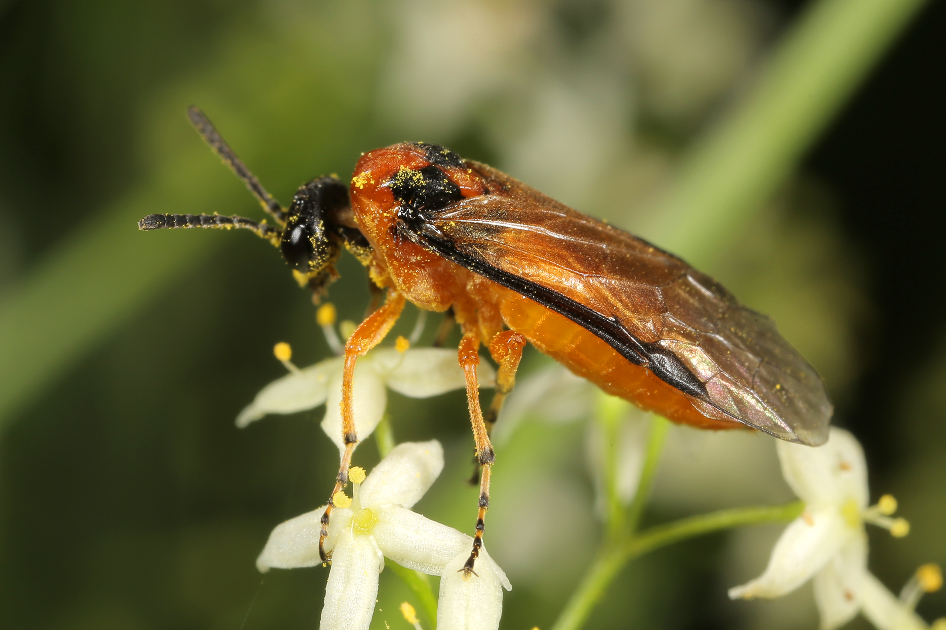 Hinterleib: beim Männchen ist das Hinterleibsende abgerundet, beim Weibchen spitz auslaufend und mit dem Sägeapparat versehen.
