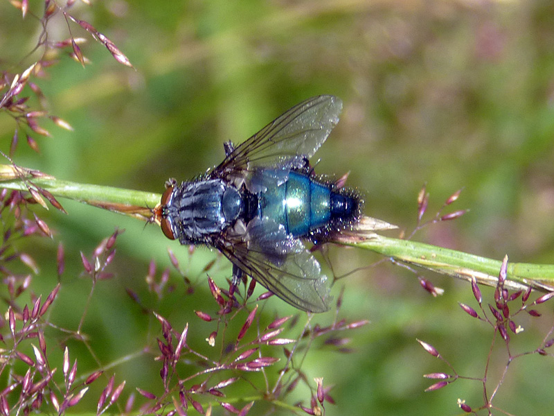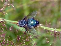 Große Fliege (7-18 mm) mit glänzend metallisch blauem (blaugrünem) Abdomen ohne eine Spur von Bestäubung. Gesicht gelblich. Thorax blaugrau mit undeutlichen dunkleren Längsstreifen. Unverwechselbar.