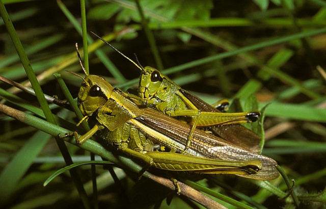 Paarung der Sumpfschrecke. Der Größenunterschied zwischen dem kleineren Männchen und dem deutlich größeren Weibchen ist dabei sehr deutlich zu erkennen. Linz im Landkreis Meißen, September 2001 (© Michael Münch)( Bild vergrößern)