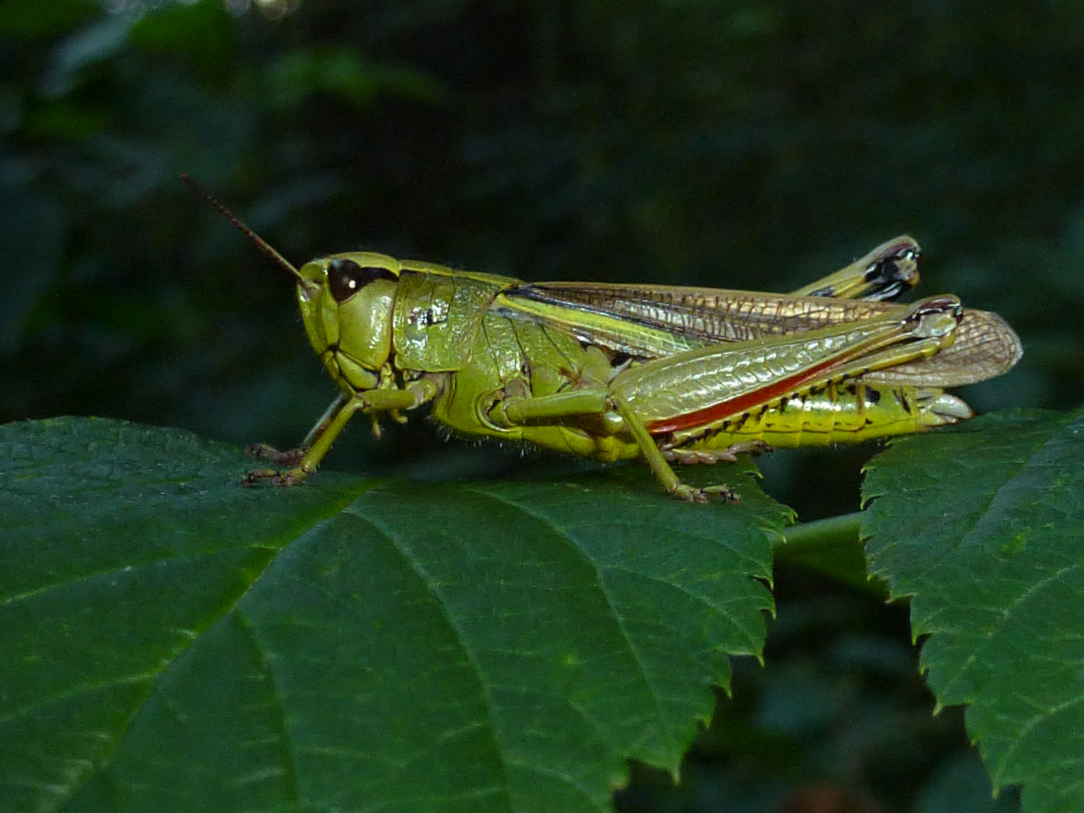 Thorax: Zapfen zwischen den Vorderhüften, Hinterschenkel grünlich mit roter Unterkante, Knie schwarz, Schiene gelb mit schwarzen Dornen. Flügel vollständig ausgebildet, Vorderflügel an der Vorderkante mit breitem gelbgrünem Längsstrich.