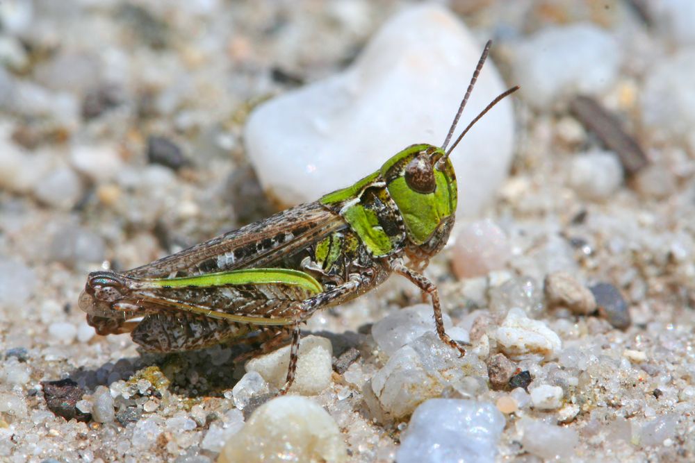 Körperfarbe braun bis grau mit grüner oder bunter Musterung, Männchen häufig mit rötlichem Hinterleib.