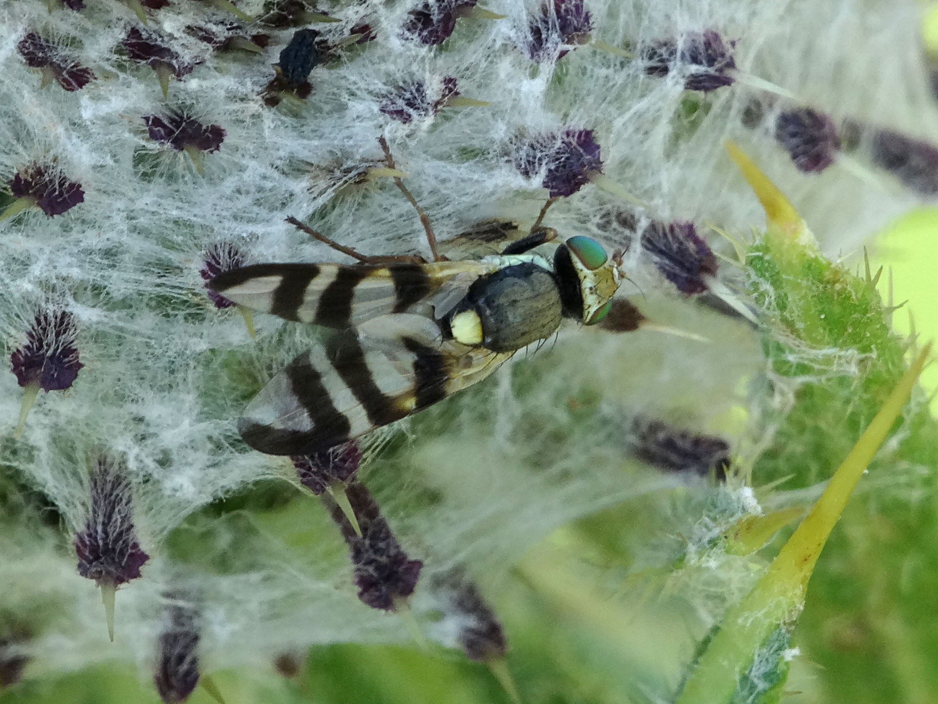 Entwicklung der Larven in Blütenköpfen von Wollkopf-Kratzdistel (Cirsium eriophorum), Gewöhnliche Kratzdistel (Cirsium vulgare), Golddistel (Carlina vulgaris) und Eselsdisteln (Onopordum spp.) (White & Korneyev 1989; Merz 1994).