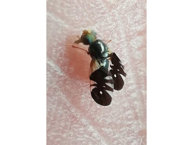 Thorax: glänzend schwarz. Die äußeren 3/4 des Flügels schwarz, mit 2 hyalinen Dreiecken am Vorderrand und 3 am Hinterrand; im dunklen bereich 2–3 kleinere, hyaline runde Flecken. Schienen (Femora) schwarz.