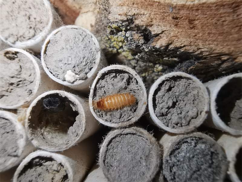 Larven leben vor allem in Brutgängen von Hymenopteren. Natürliche Lebensstätten sind damit vor allem in Totholz mit von Wildbienen besiedelten Larvengängen xylobionther Insekten zu finden. Besiedelt werden jedoch auch Insektenhotels. Zum Teil können mehrere 100 Larven in Mauerbienen-Nisthilfen auftreten.