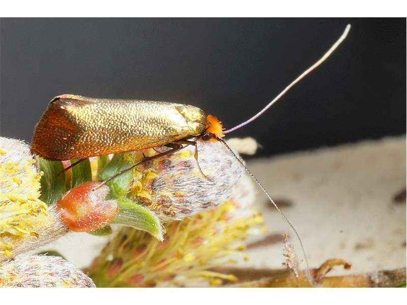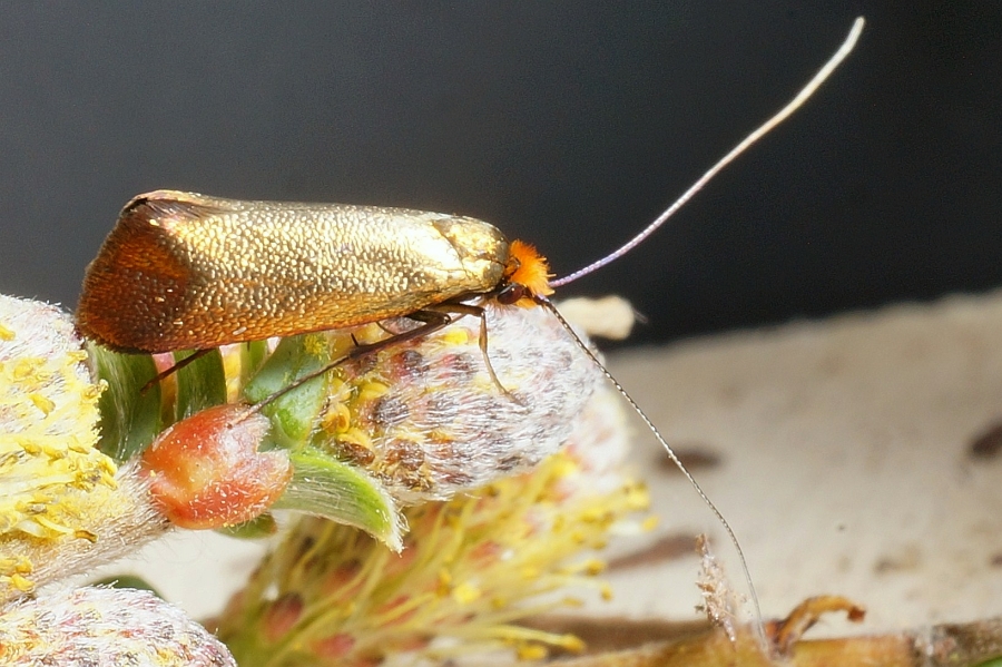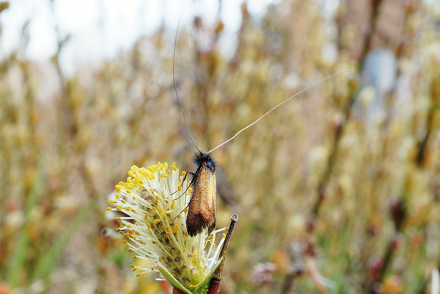 Adela cuprella ist eine Frühlingsart. Die Falter sind an blühenden Weidenkätzchen finden.