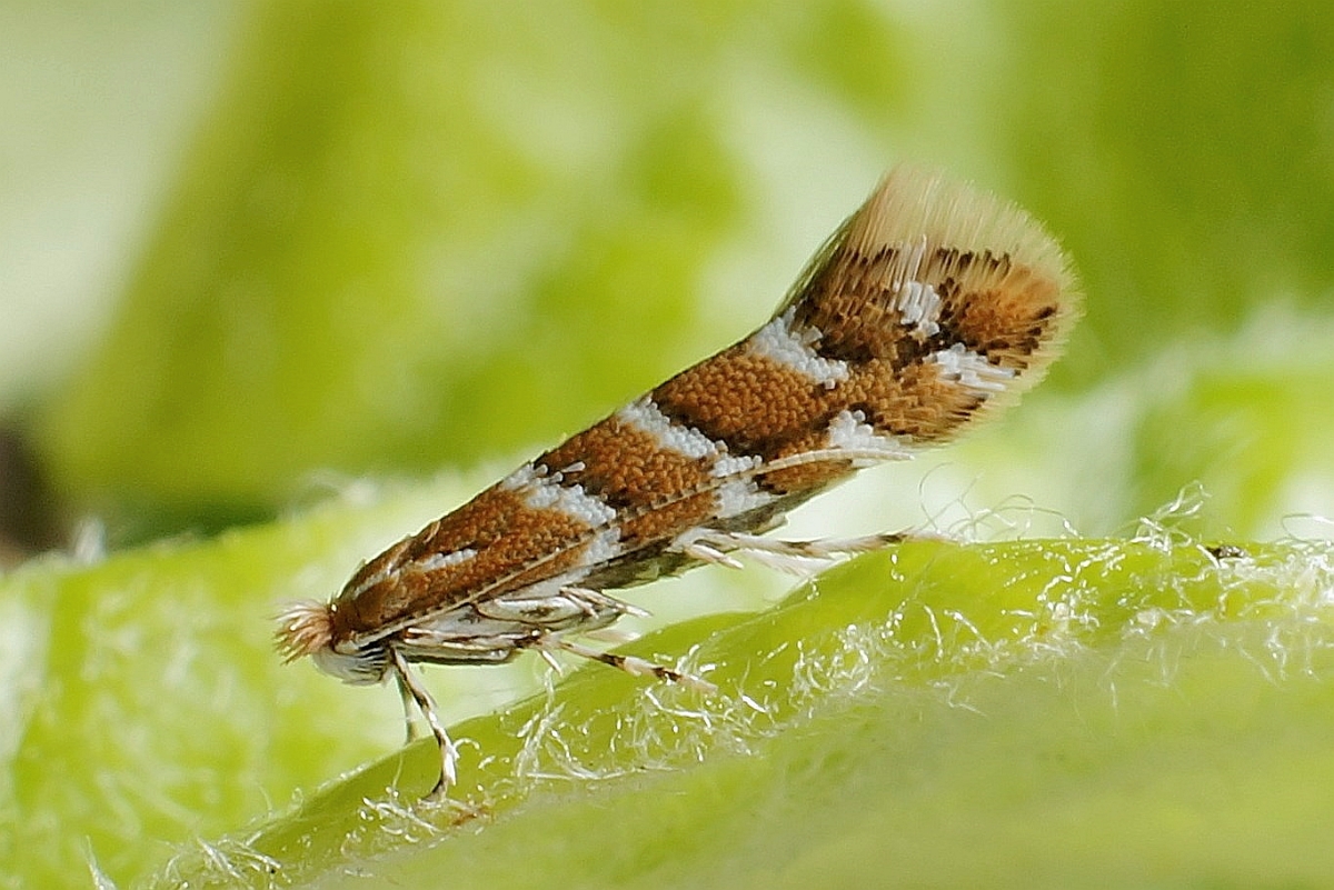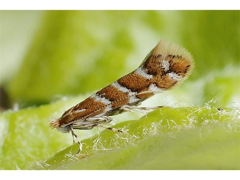 Flügelspanne 6–7,5 mm. Vorderflügel orange-braun glänzend, basal mit einer weißen Längslinie, gefolgt von zwei durchgehenden weißen Querlinien, die fast gerade und überwiegend nach außen schwarz begrenzt sind. Es folgt eine dritte Querlinie, die aus einem in einem stumpfen Winkel zueinander liegenden Paar Punkte, welche sich in der Flügelmitte fast treffen, besteht. Im Terminalbereich des Vorderflügels zwei weitere weiße Bänder, die fast einen rechten Winkel zueinander bilden.
