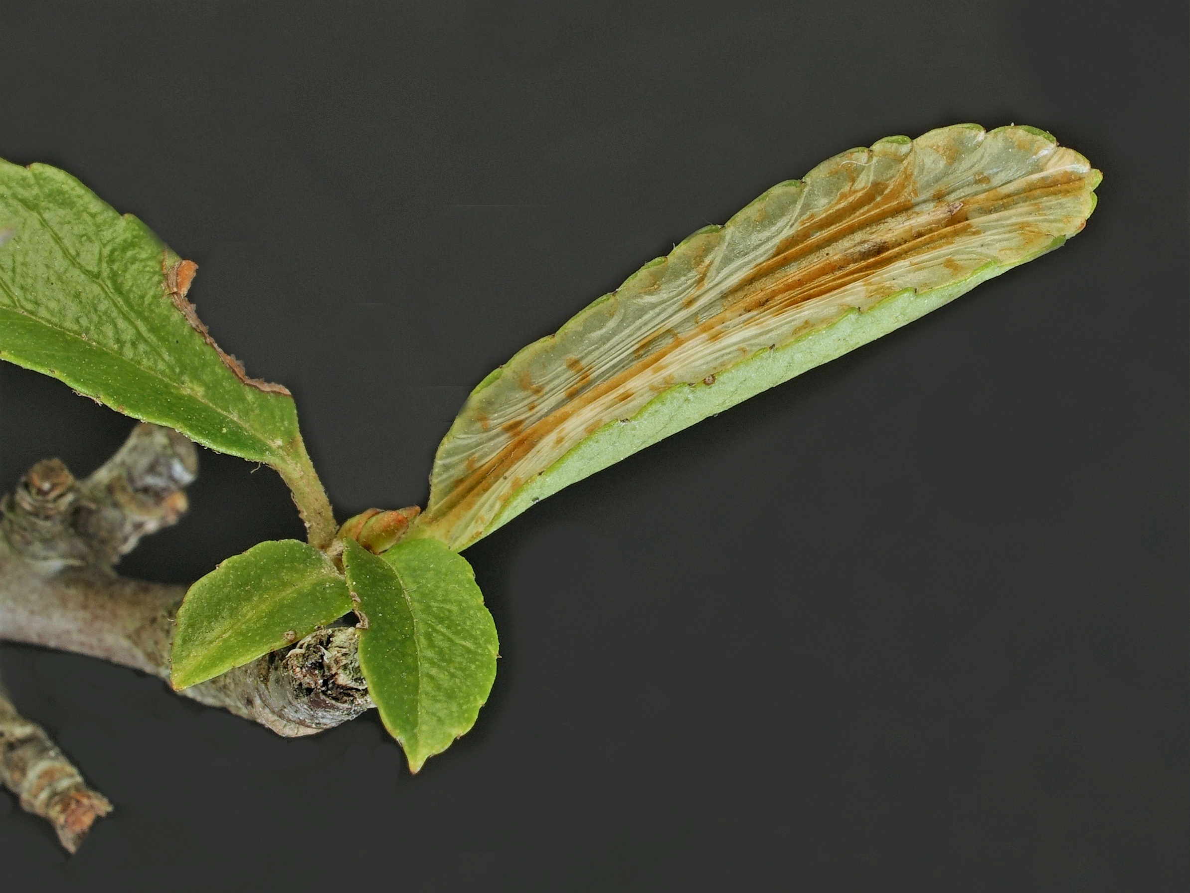 Oberseitige Faltenmine einer halbwüchsigen Larve an Feuerdorn ( Pyracantha coccinea). Zeißholz, 28.04.2021