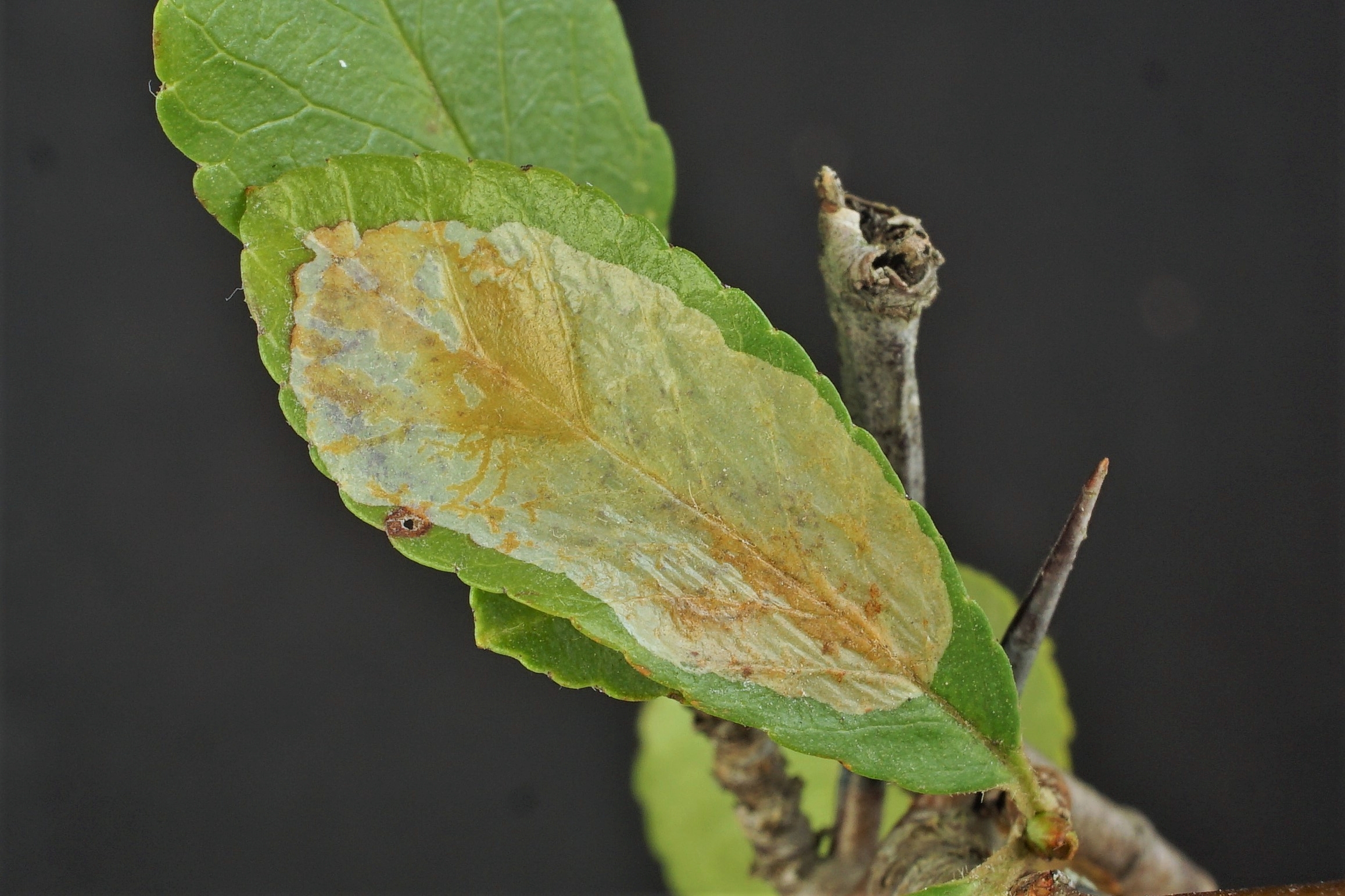 Oberseitige Faltenmine einer Junglarve an Feuerdorn (Pyracantha coccinea). Zeißholz, 28.04.2021