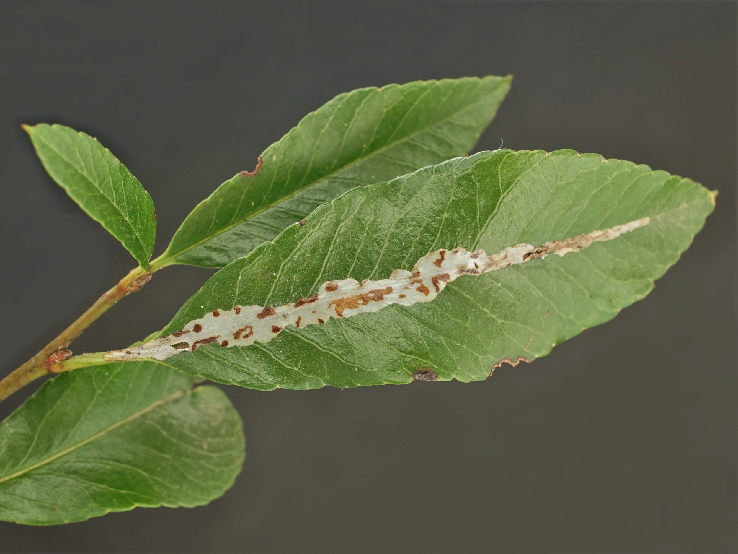 Die Larven erzeugen Faltenminen in den Blättern des Feuerdorns (Pyracantha coccinea). Belegt sind auch Funde an Zwergmispel (Cotoneaster sp.). Es treten mehrere sich überschneidende Generationen im Jahr auf. Bevorzugt werden Ästchen mit Blättern im inneren des Strauches besiedelt.