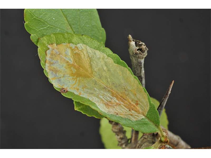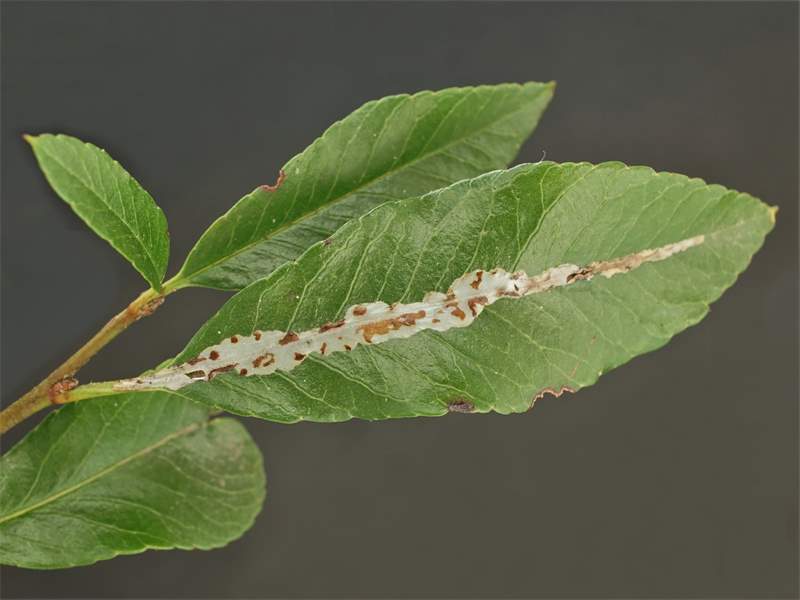 Mine: Jugendmine oberseitig, schmal, entlang der Mittelader eines Blattes, bei der halbwüchsigen Larve breit, manchmal blattfüllend und bei der erwachsenen Larve breit, die Blattränder einander zusammenfaltend.