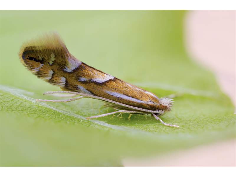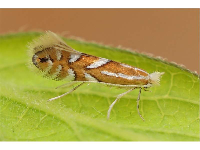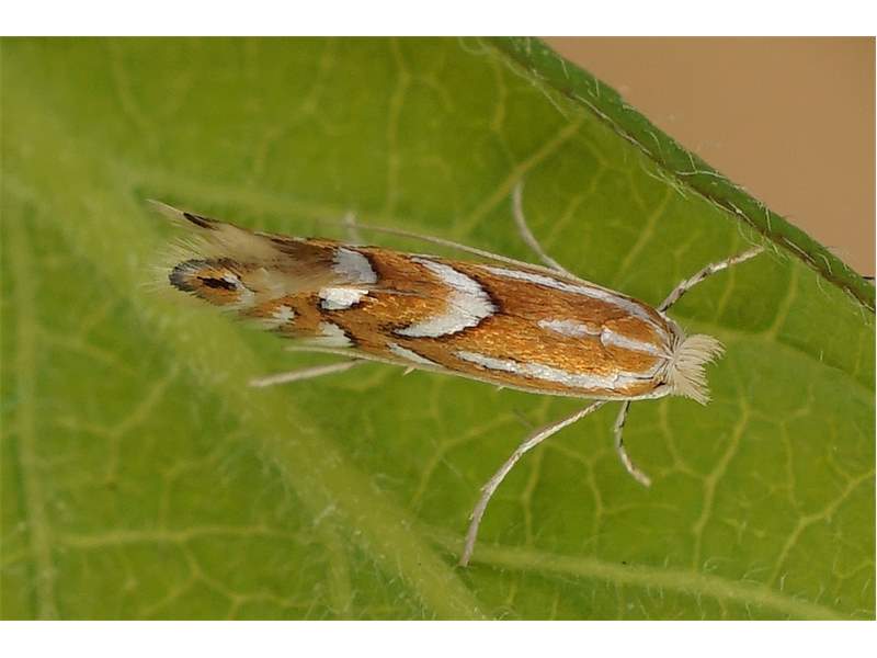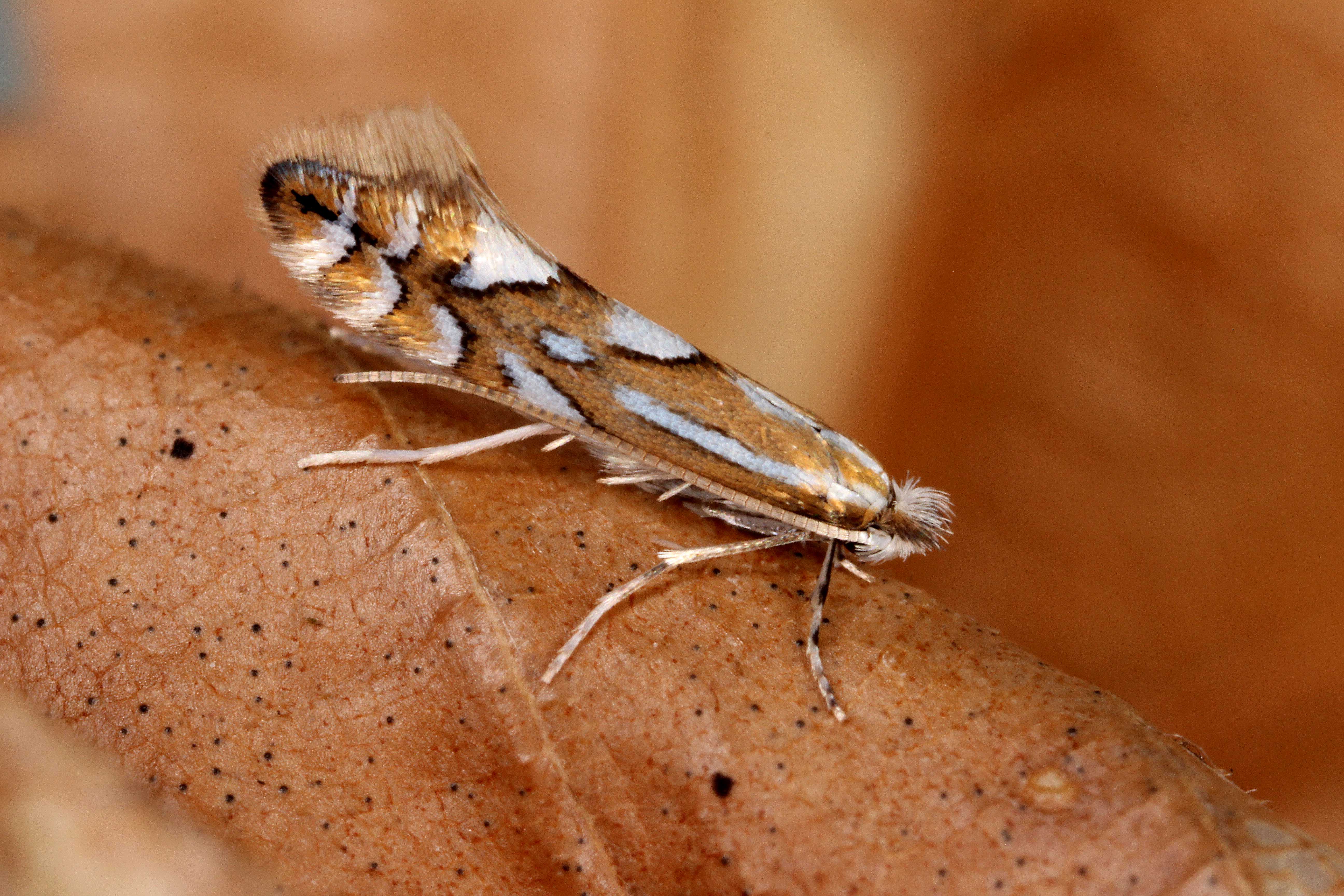 Am 01.02.2016 geschlüpfter Falter von Phyllonorycter maestingella, eingetragen aus Blattminen an trockenem Buchenlaub am 28.12.2015. (© Thomas Sobczyk)( Bild vergrößern)