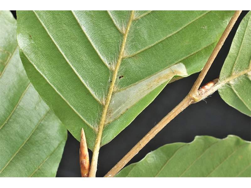 Die Art miniert in den Unterseiten von Buchenblättern (Fagus sylvatica). Zur Flugzeit findet man die Falter auf Buchblättern oder Buchenstämmen sitzend.