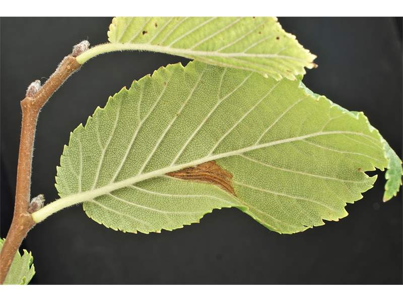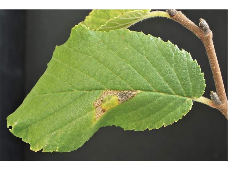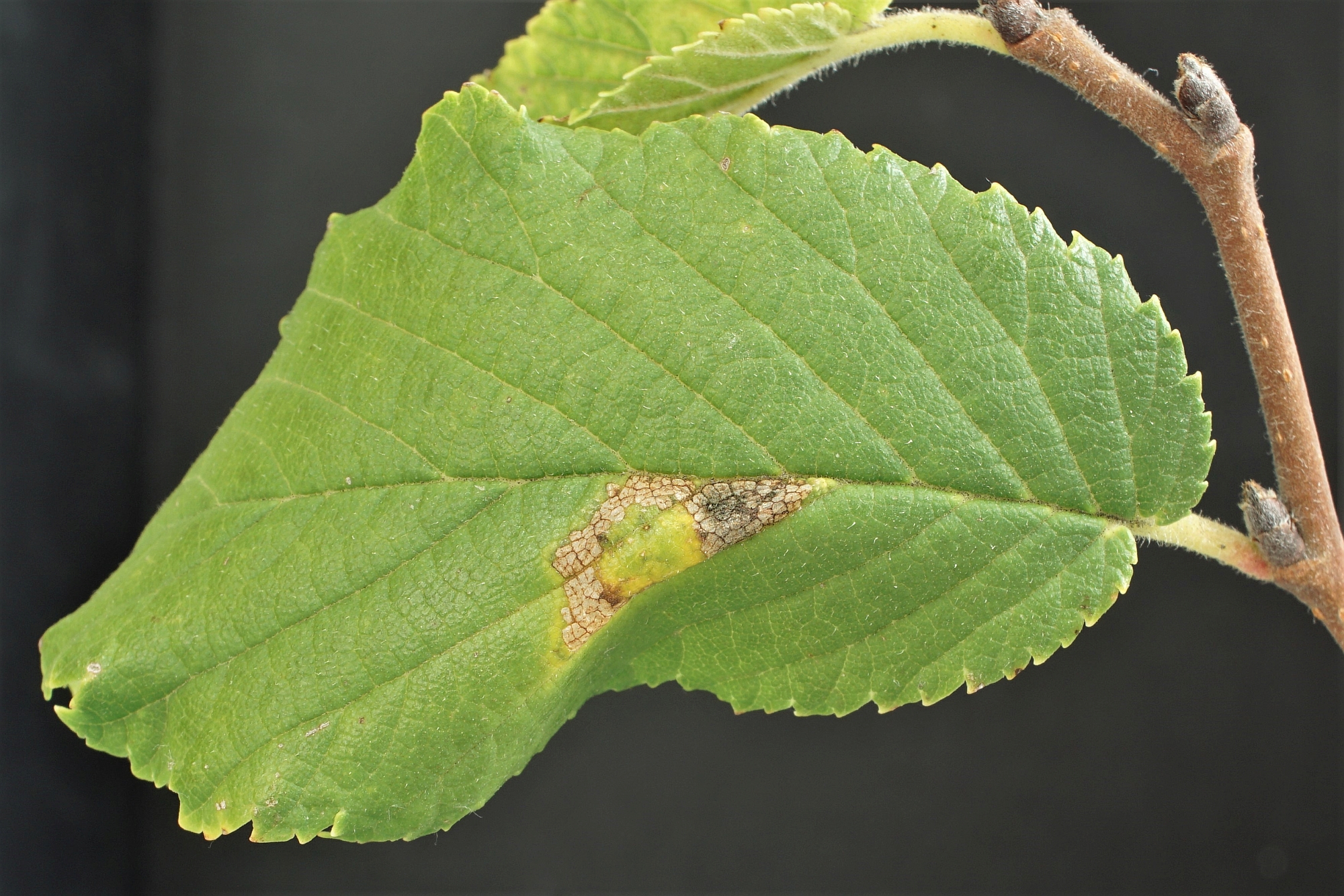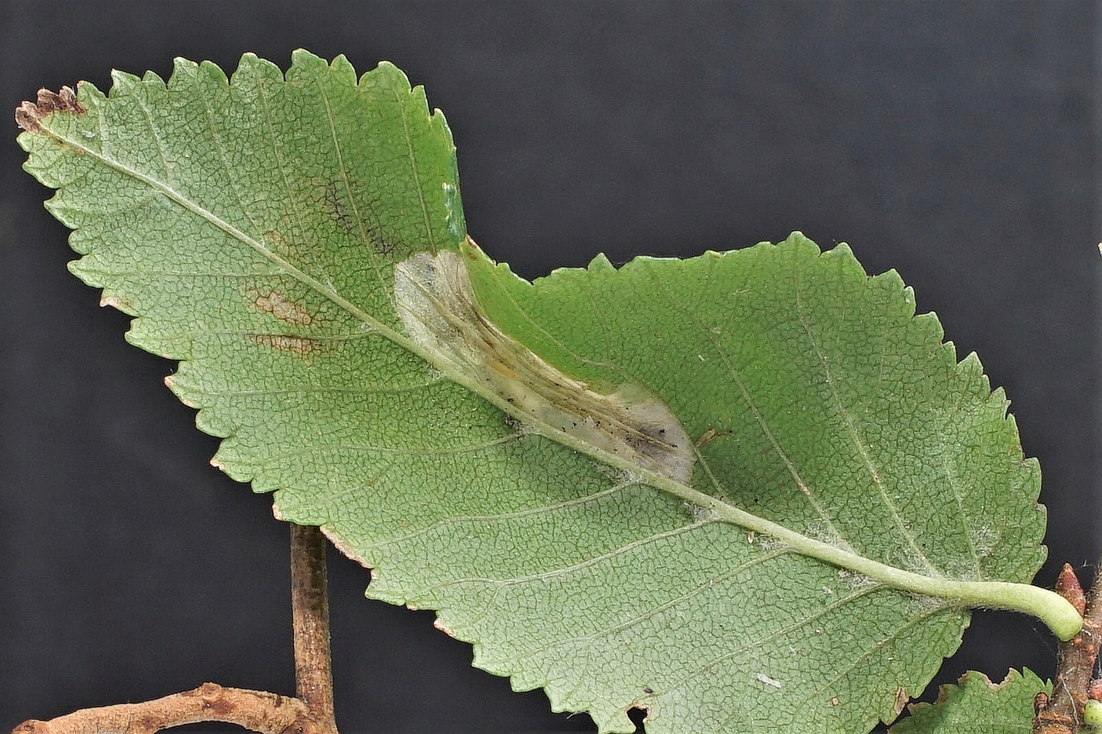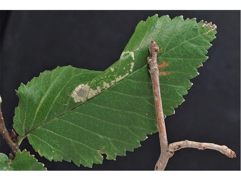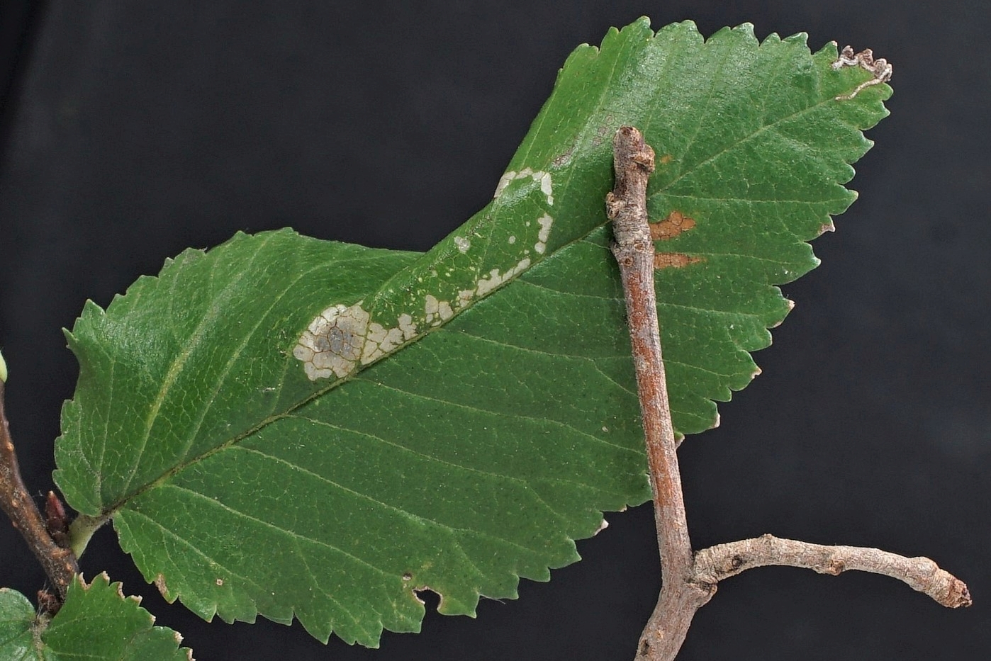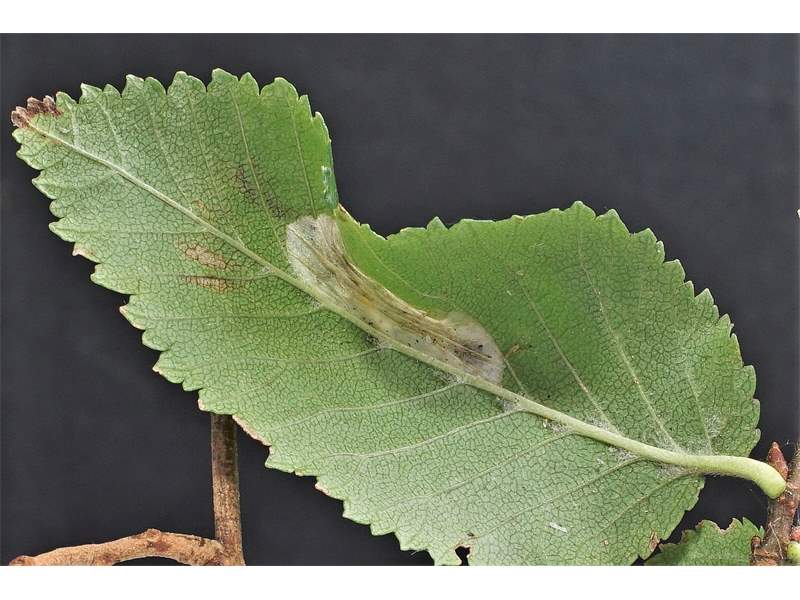 Die Larven leben in Faltenminen an der Blattunterseite von Bergulme (Ulmus glabra), Feldulme (Ulmus minor) und Flatterulme (Ulmus laevis). gefunden.